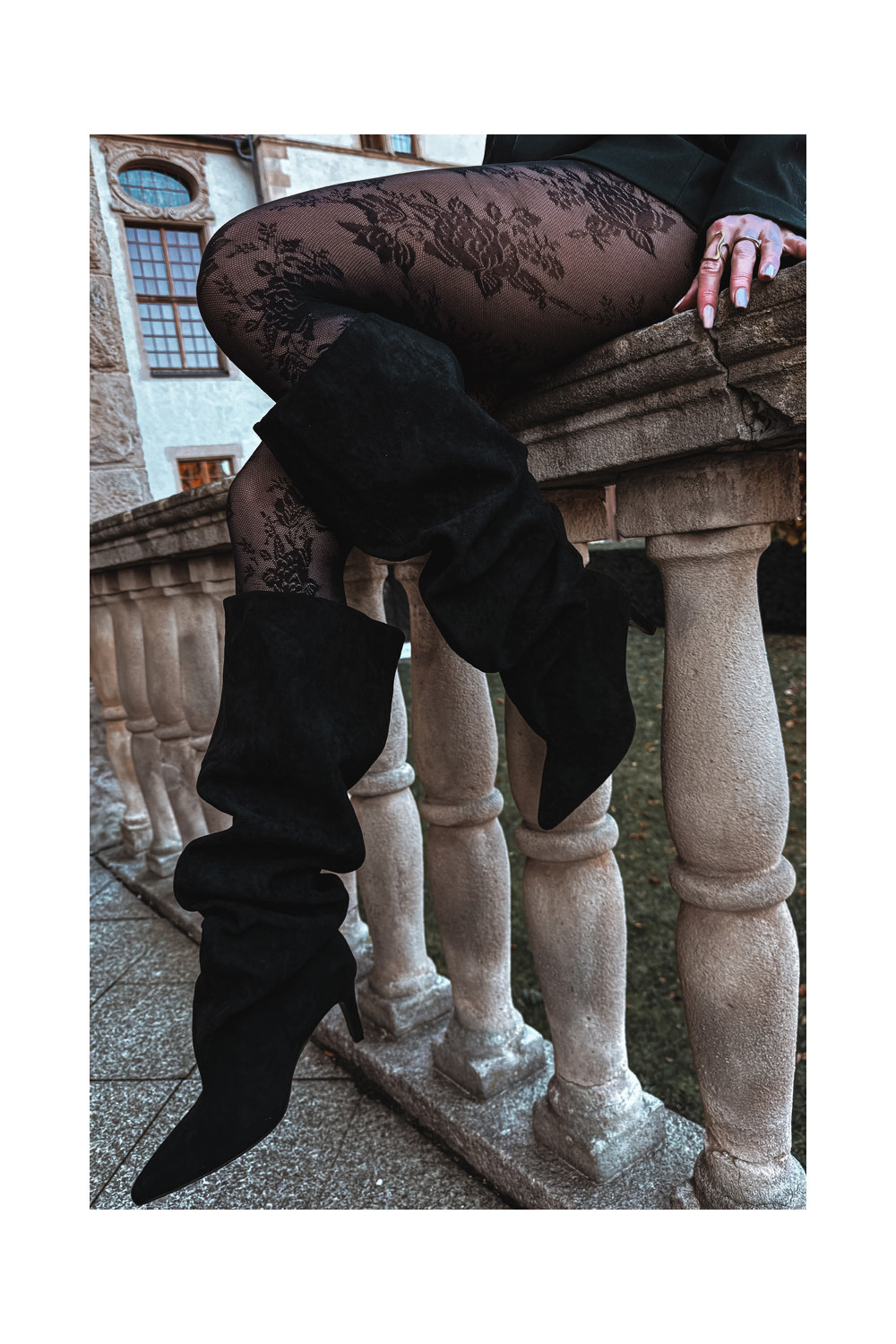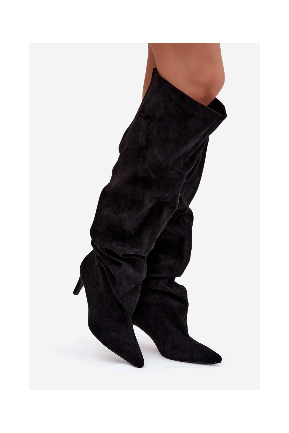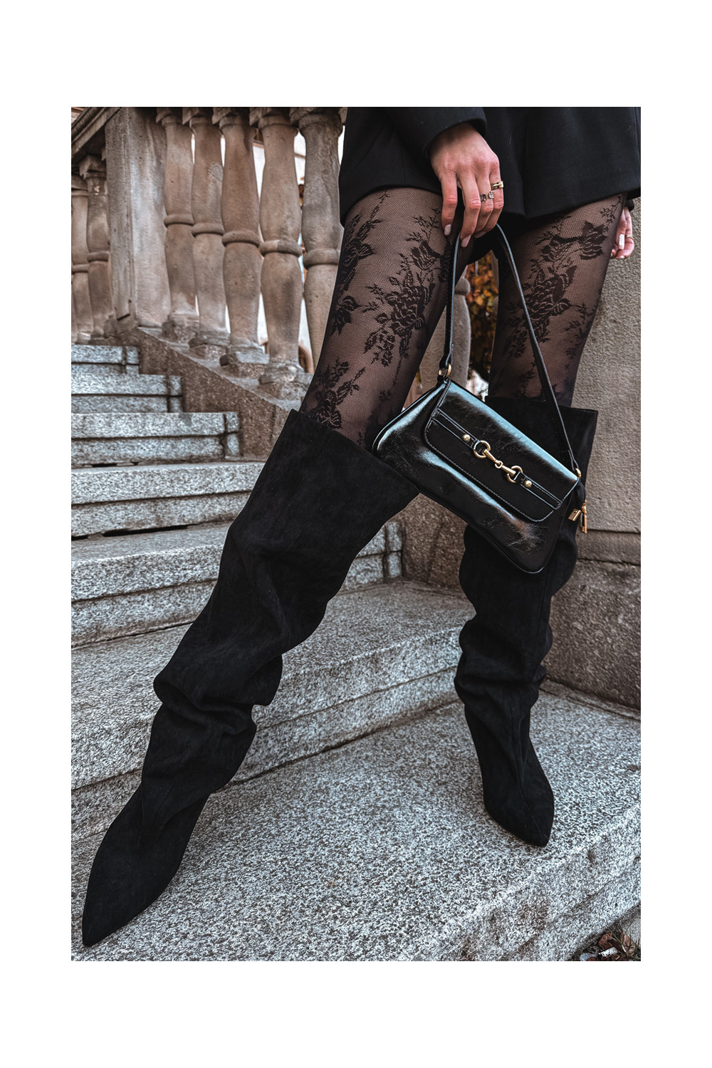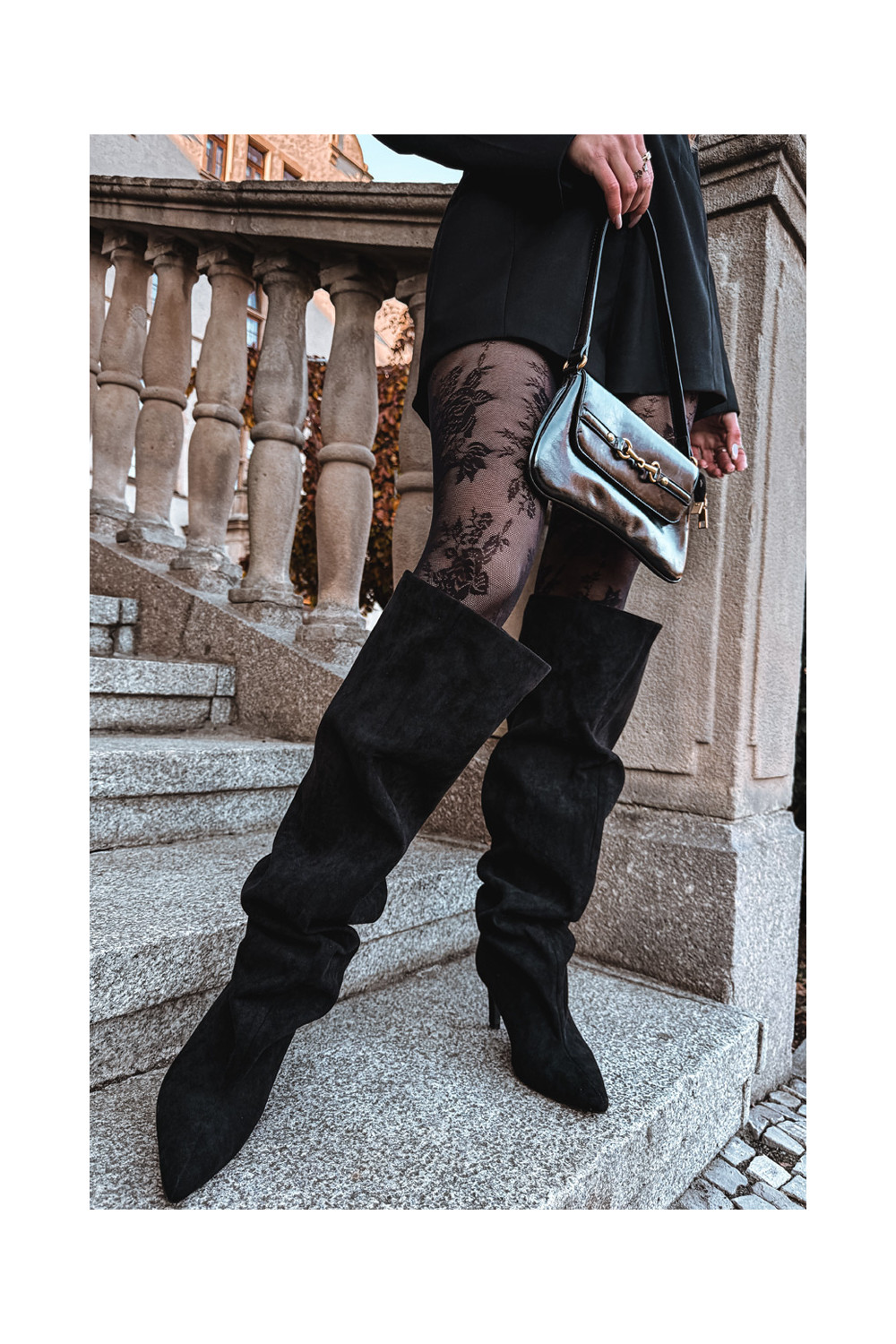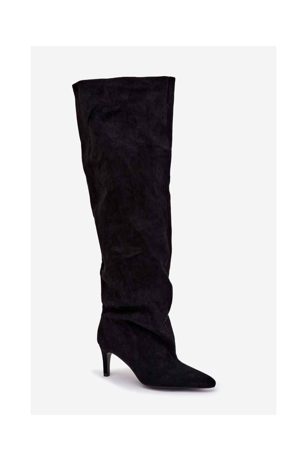 Taivilla naiste kõrgsaapad õhukeste kontsadega, sisseastumise mudel, must