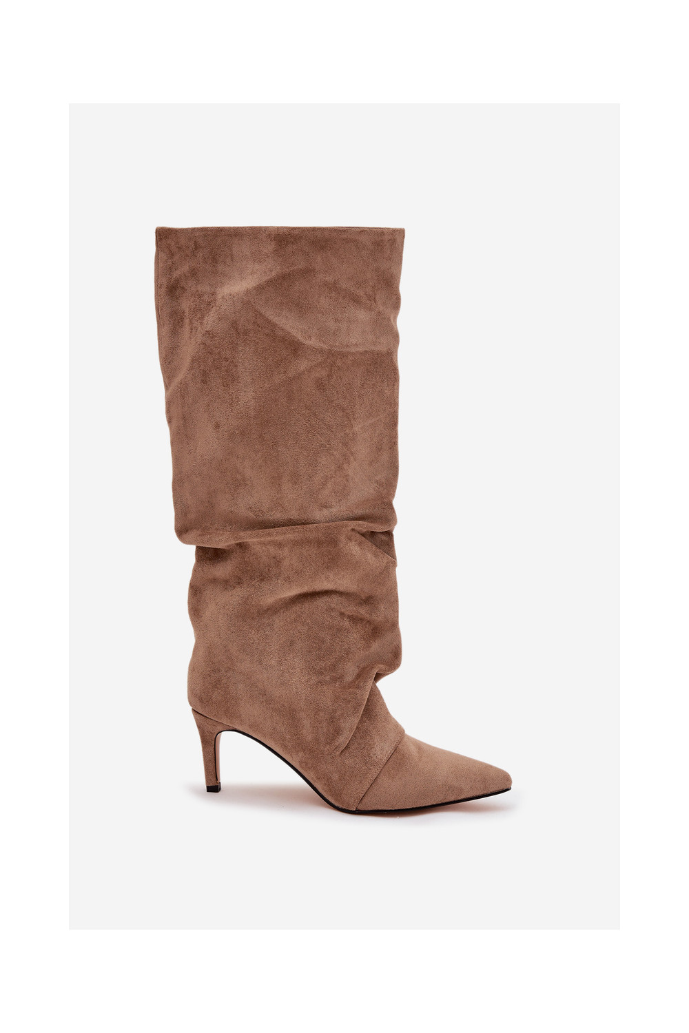 Beige värvi kortsus sooja voodriga pikad saapad õhukeste kontsadega kunstsuede peal Tai turivella