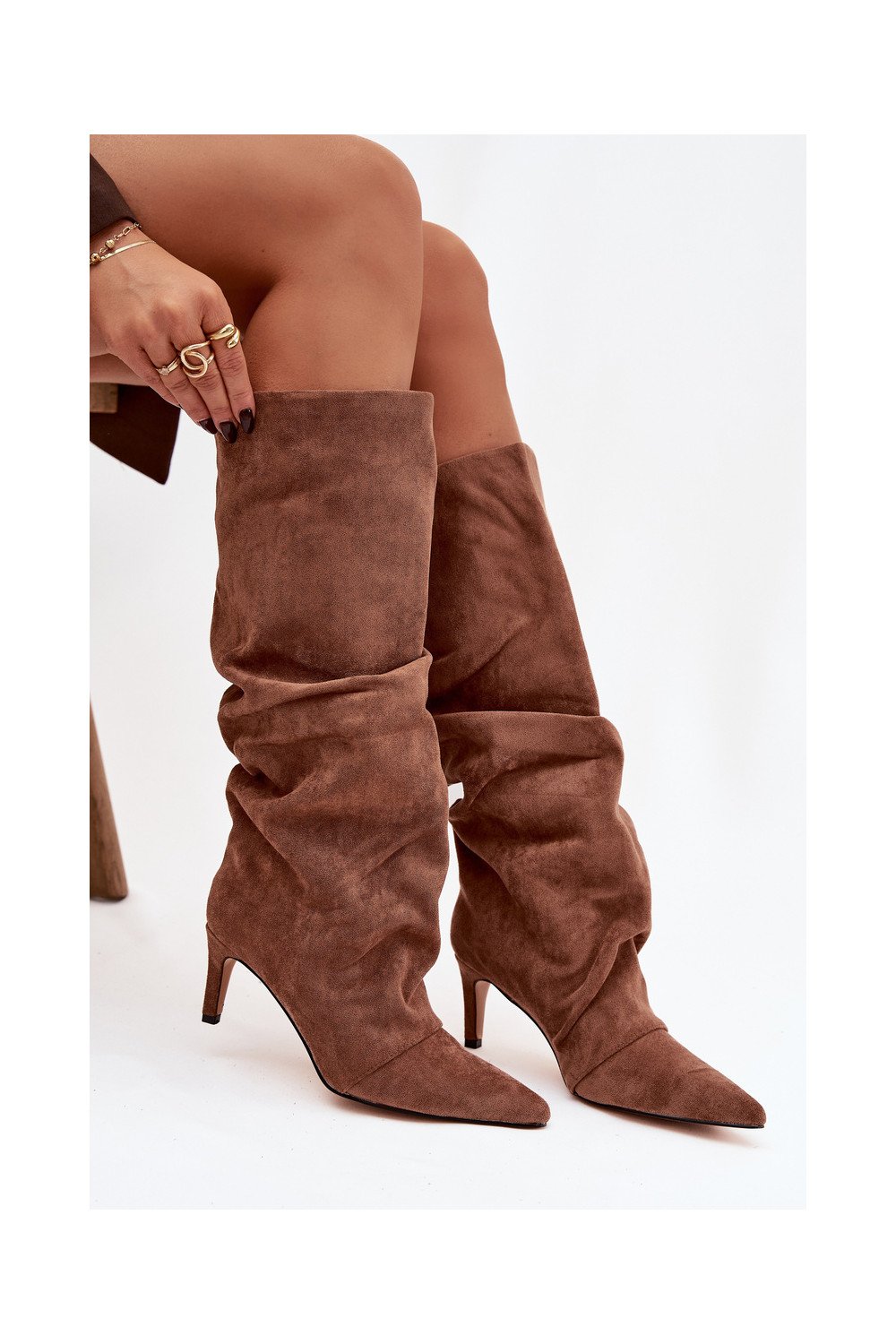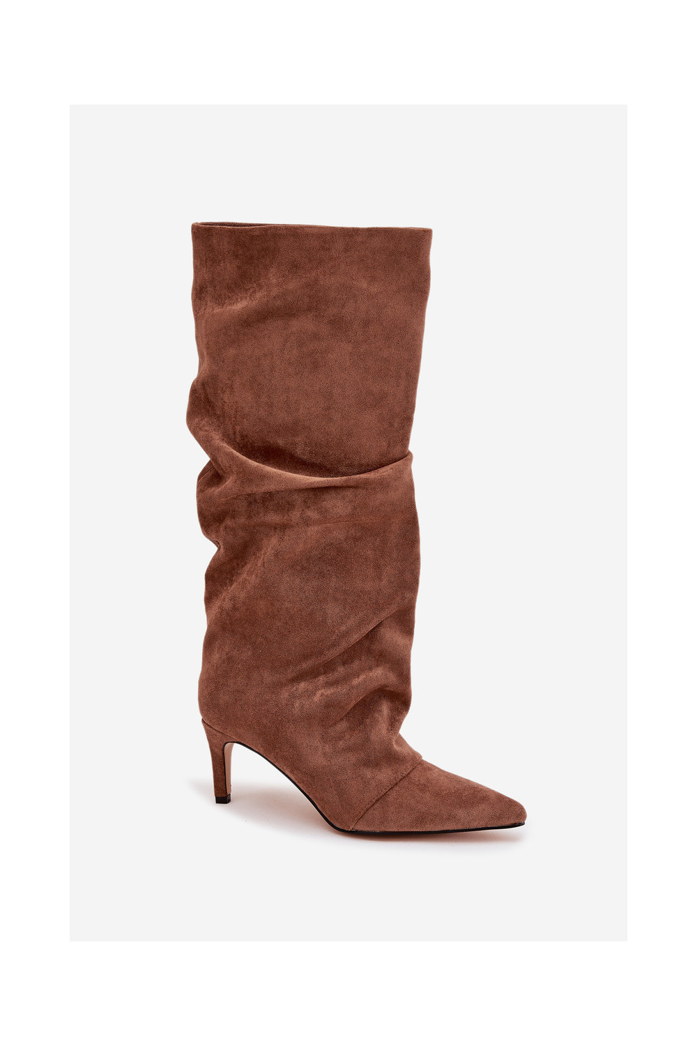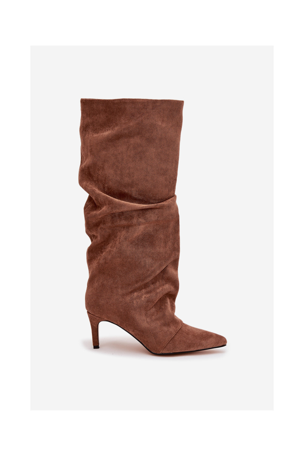 Beige värvi kortsus sooja voodriga pikad saapad õhukeste kontsadega kunstsuede peal Tai turivella