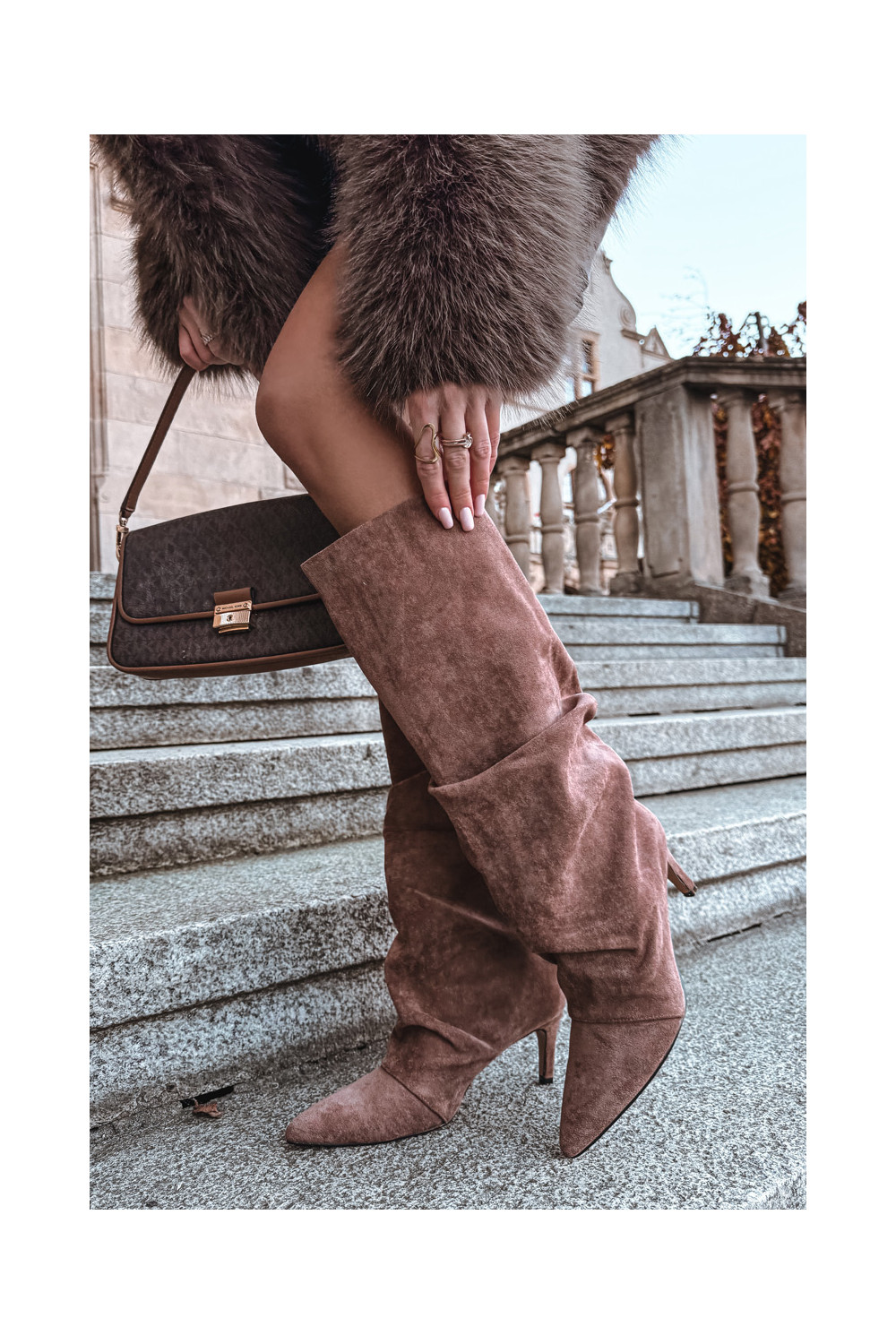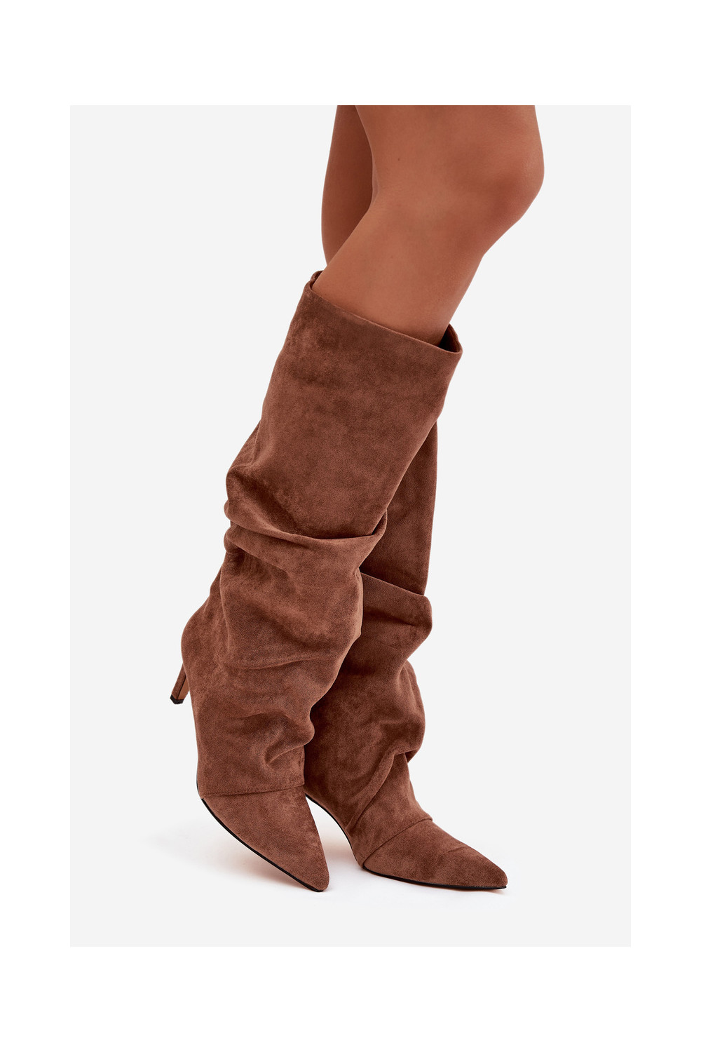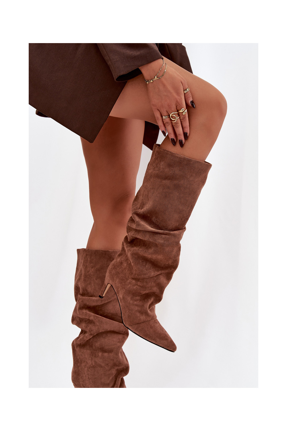 Beige värvi kortsus sooja voodriga pikad saapad õhukeste kontsadega kunstsuede peal Tai turivella