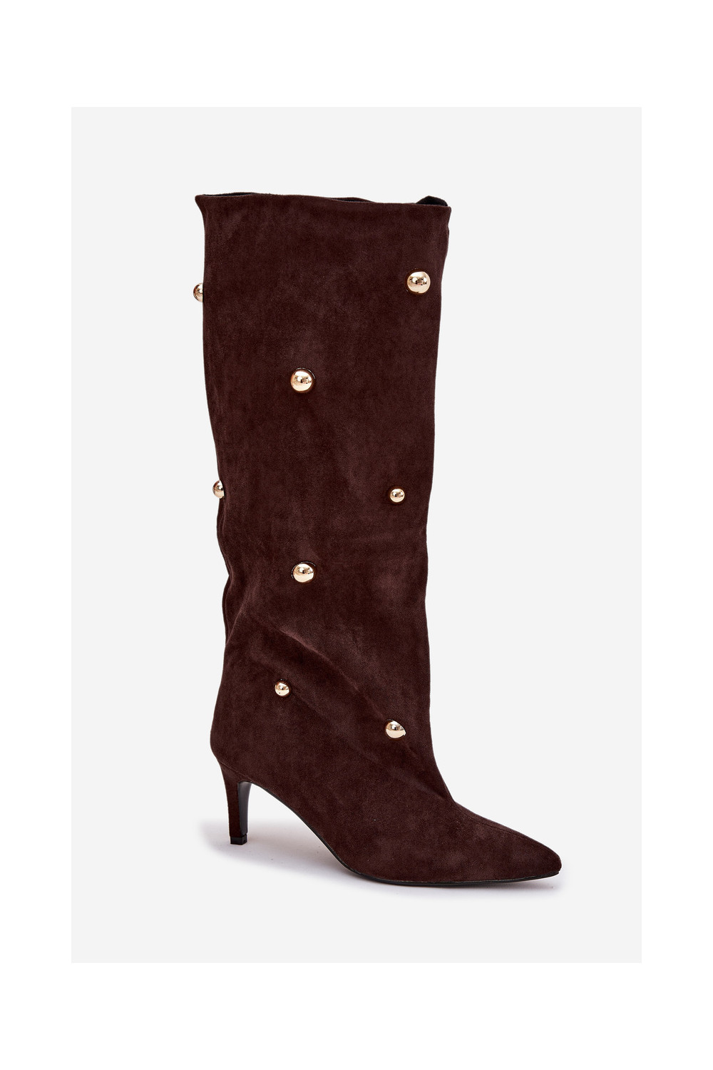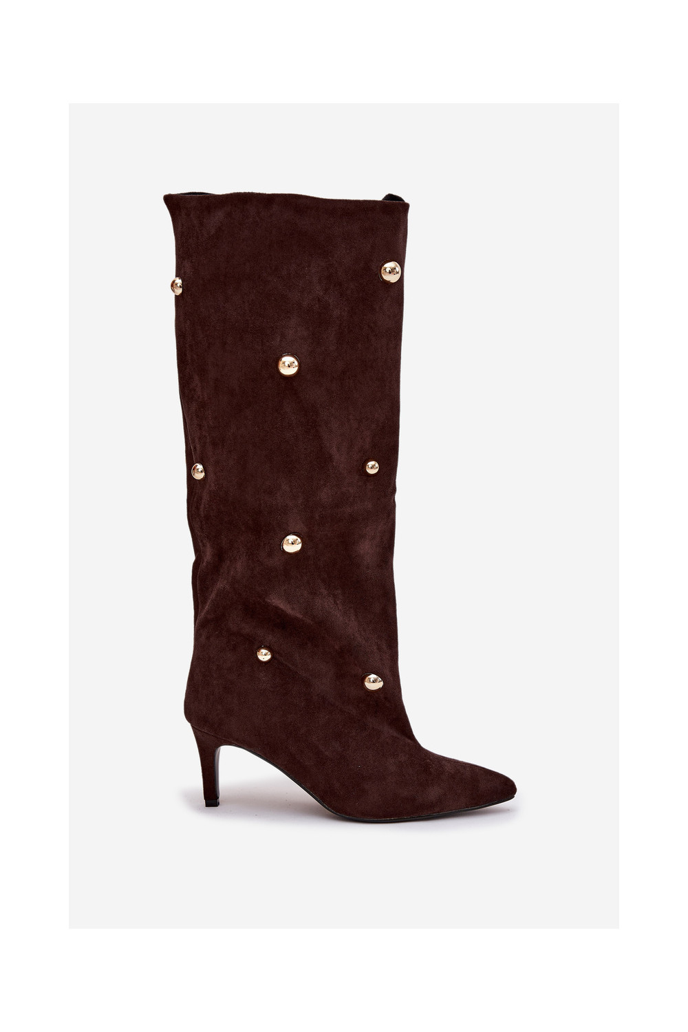 Slip-on naiste pika säärega saapad kõrge jämeda kontsaga Ze Kuldset värvimi Ozdobami Czekoladosissee Thaliane