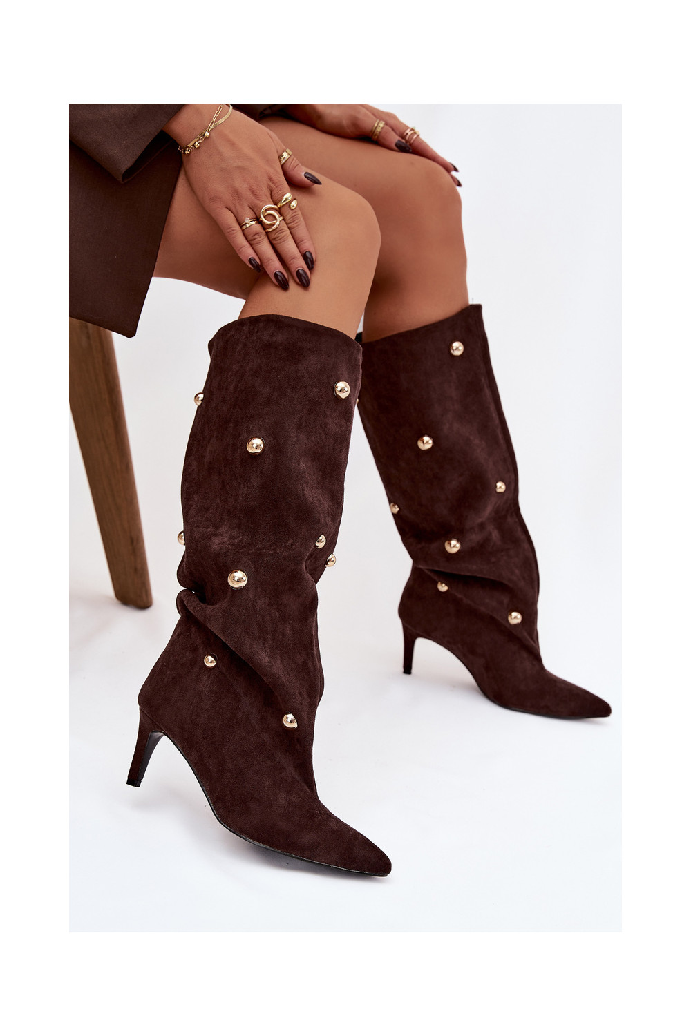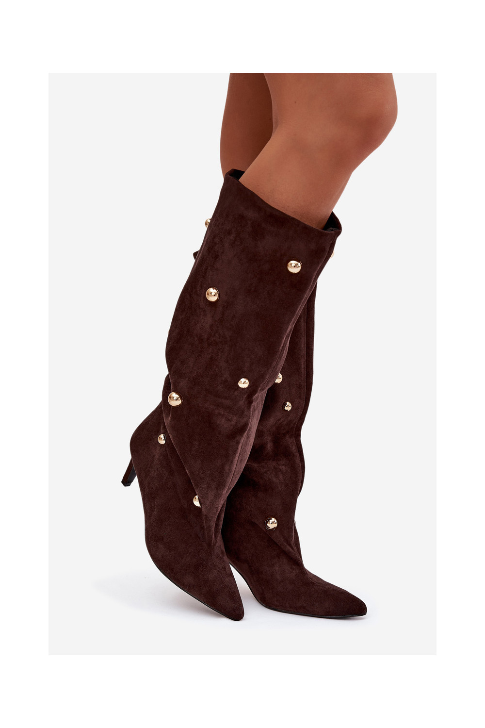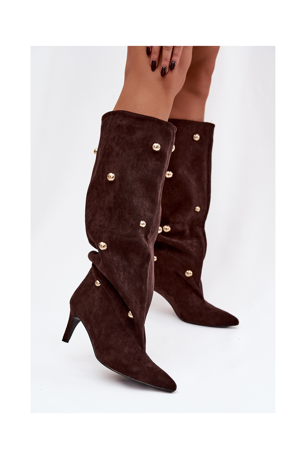 Šokolaadi värvi kergesti jalga tõmmatavad naiste pikad saapad õhukeste kontsadega ja kuldsete kaunistustega Thaliane