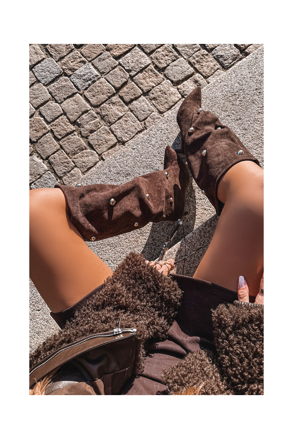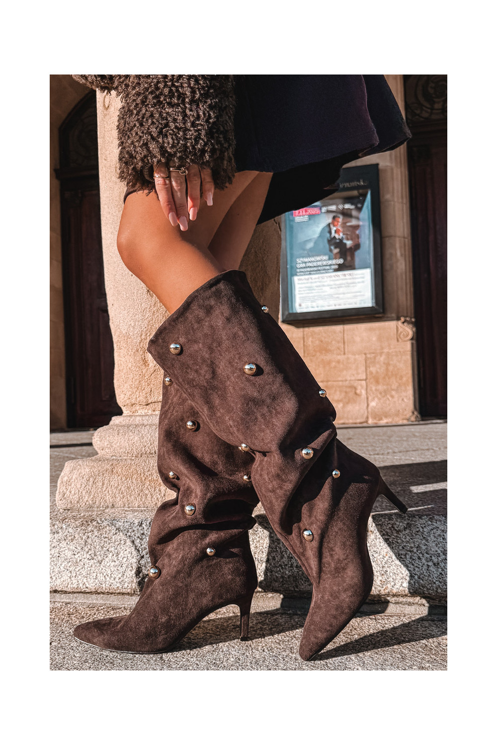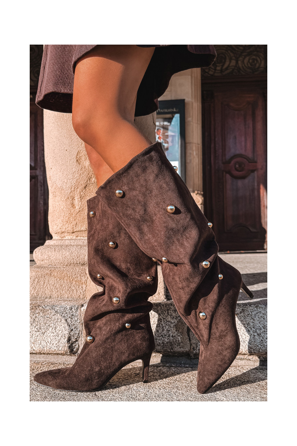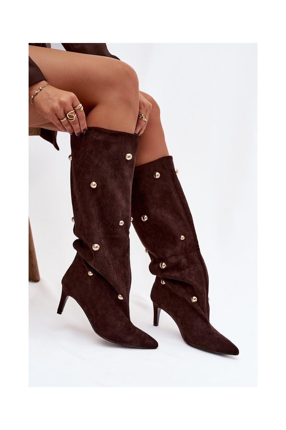 Šokolaadi värvi kergesti jalga tõmmatavad naiste pikad saapad õhukeste kontsadega ja kuldsete kaunistustega Thaliane