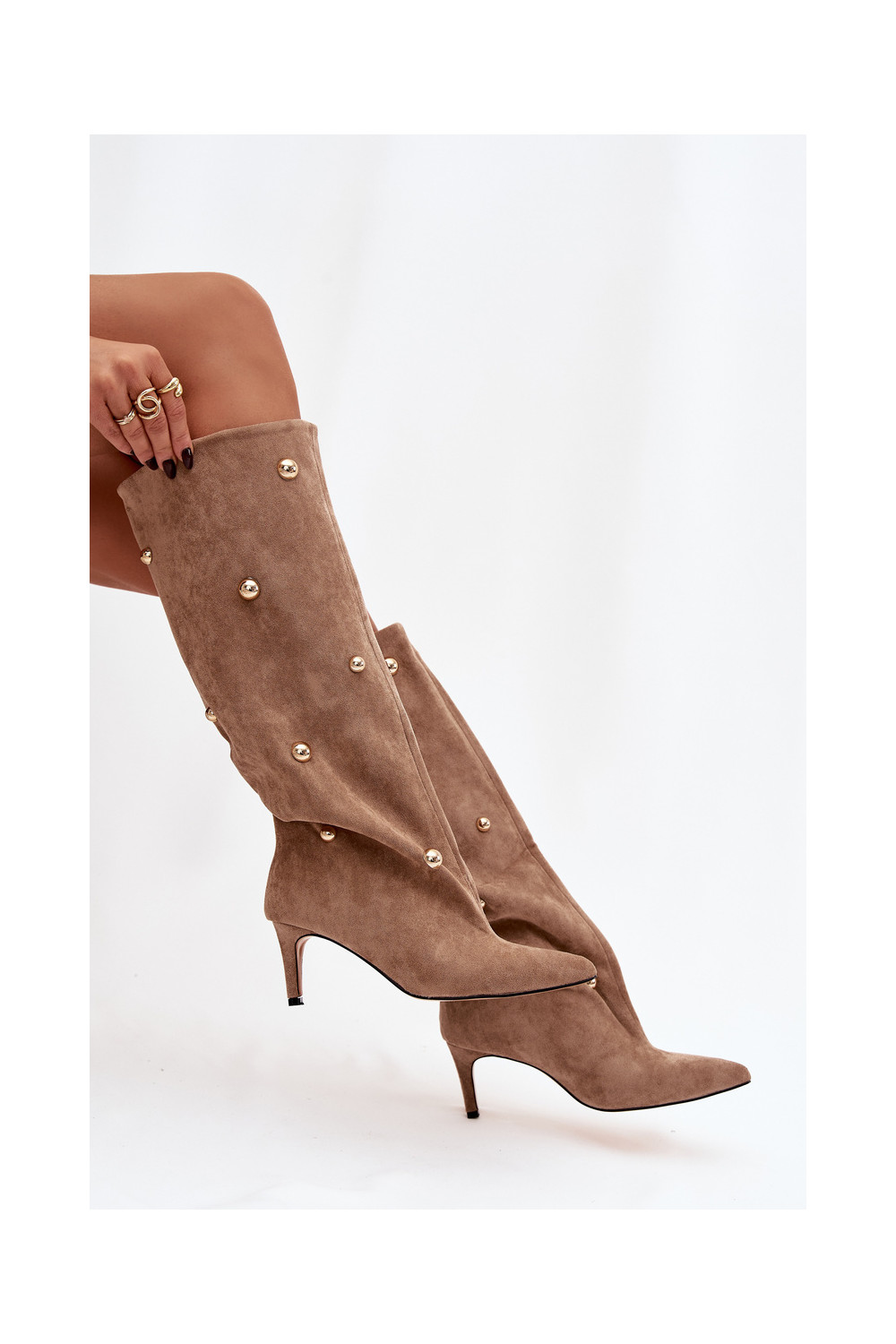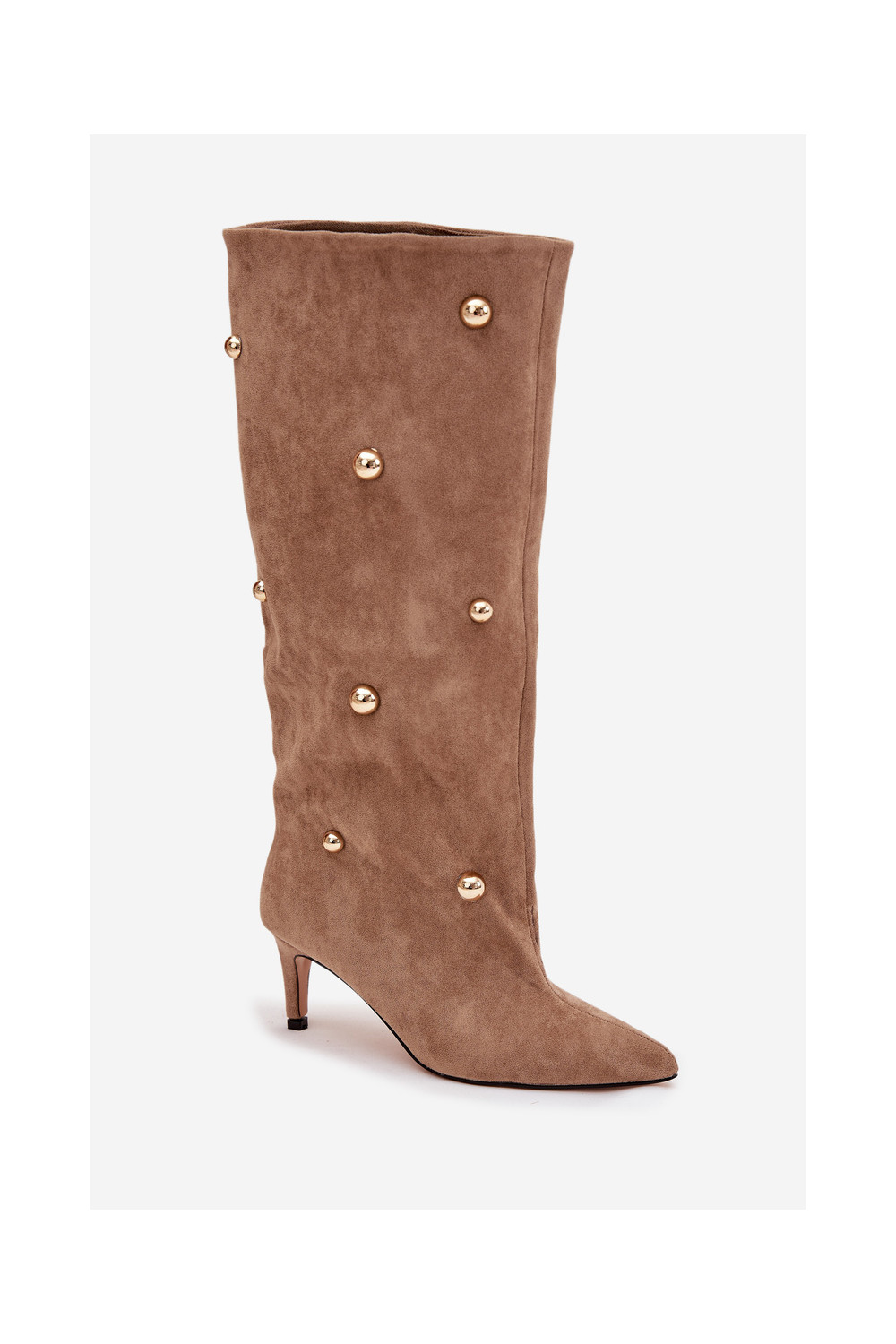 Slip-on naiste pika säärega saapad kõrge jämeda kontsaga Ze Kuldset värvimi Ozdobami beeži värvi Thaliane
