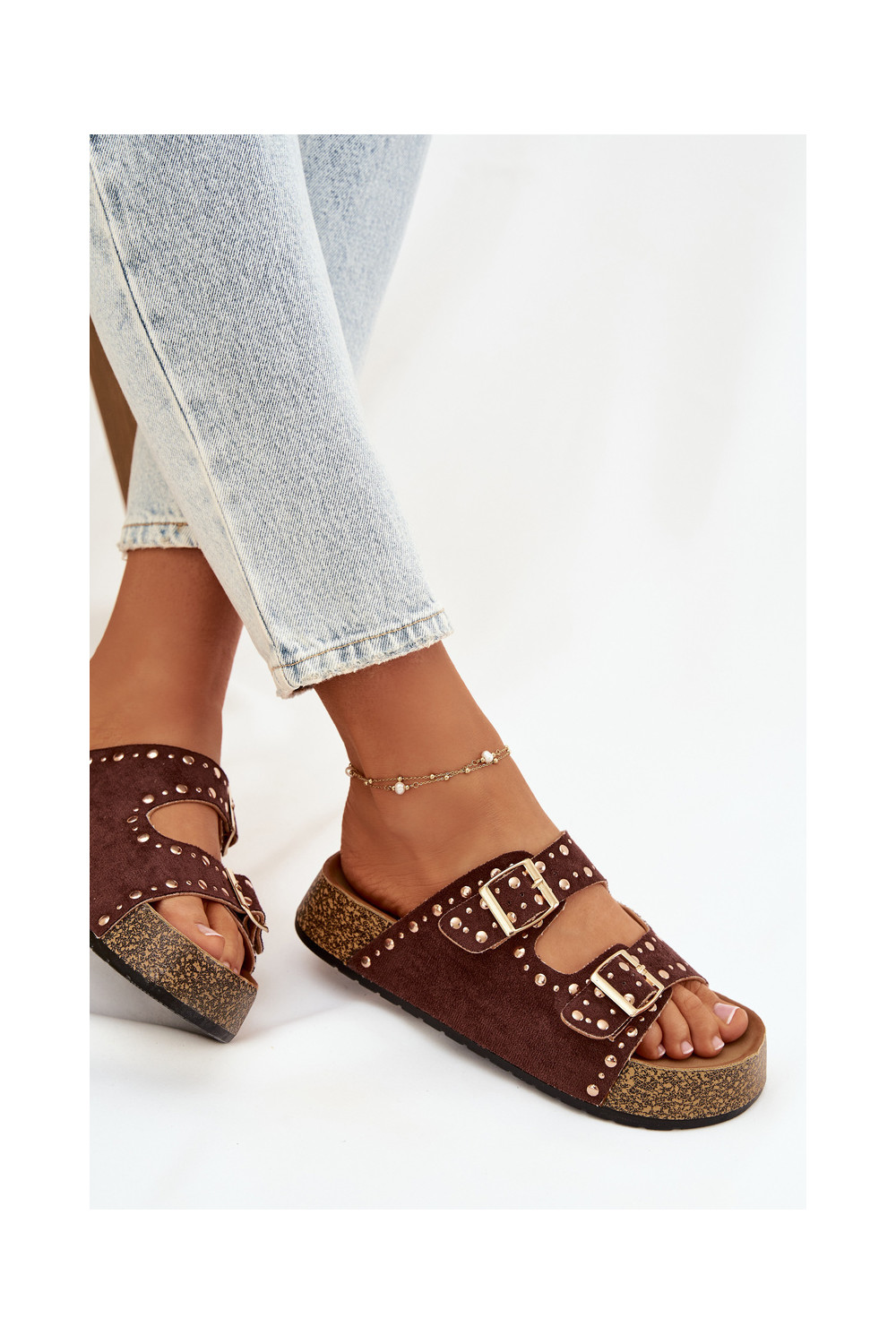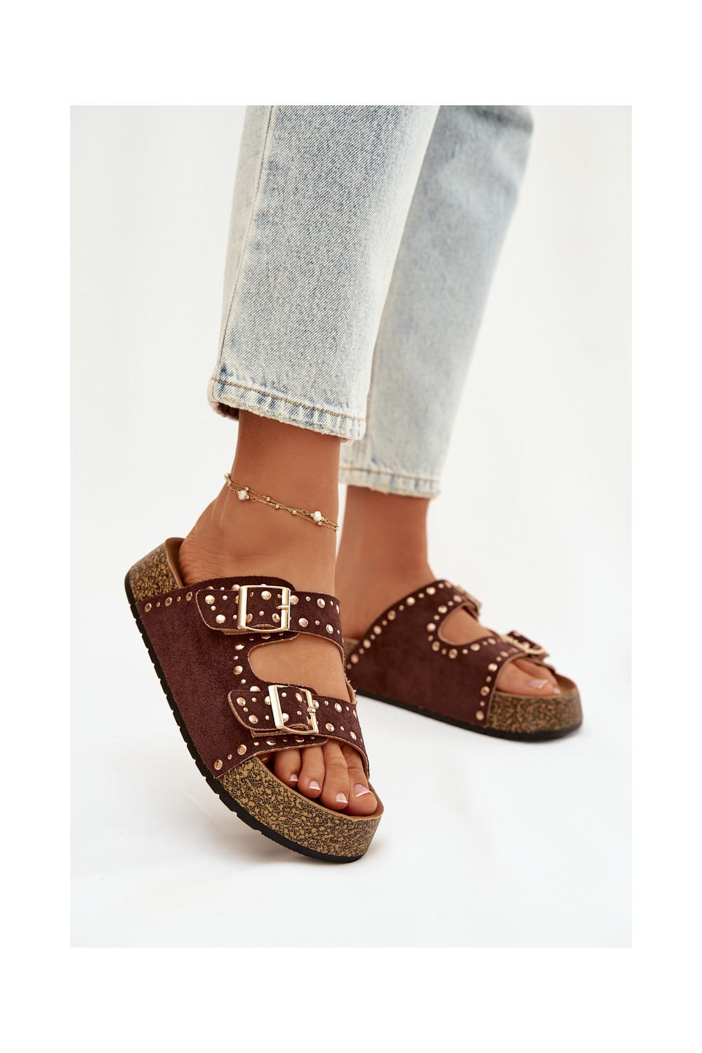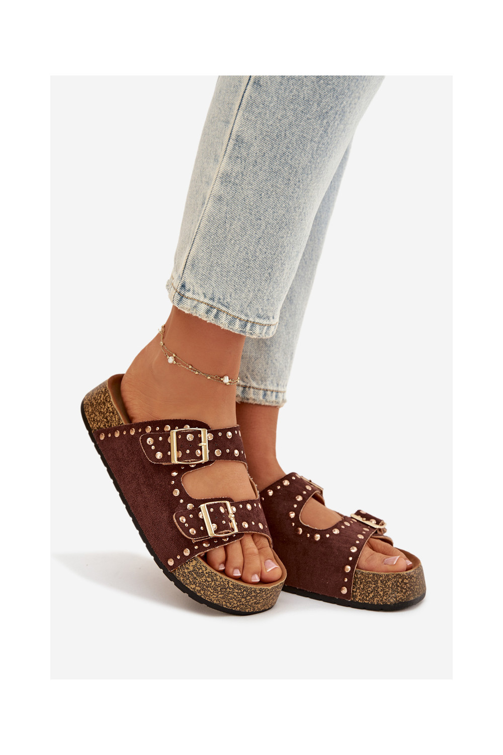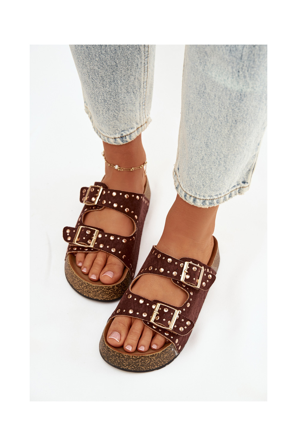 Naistel pruunid sussid kuldsete klambrite ja nupudega Tervina