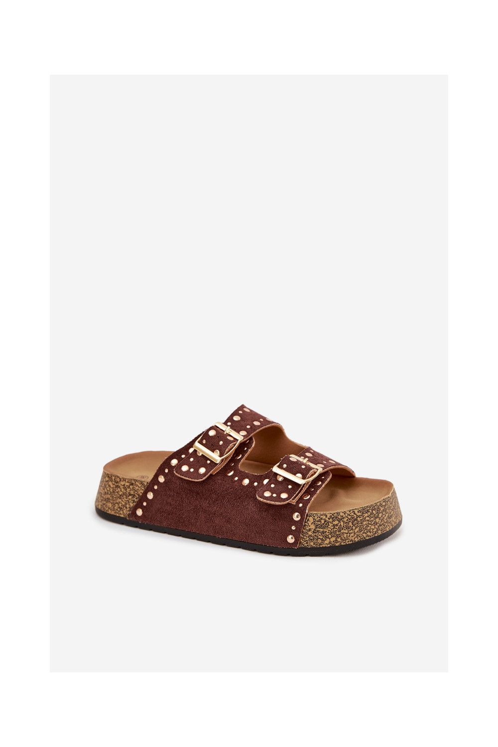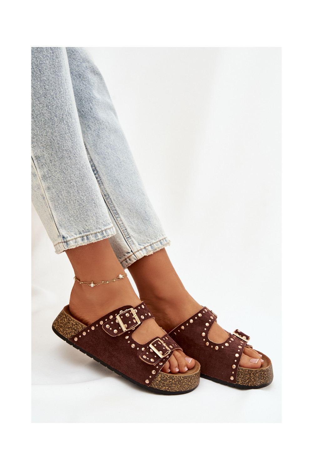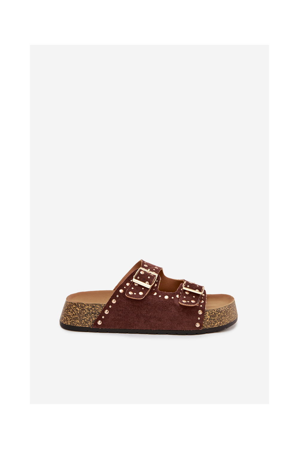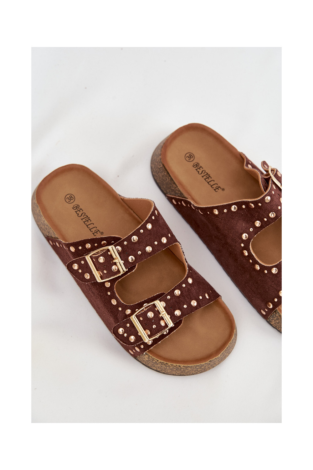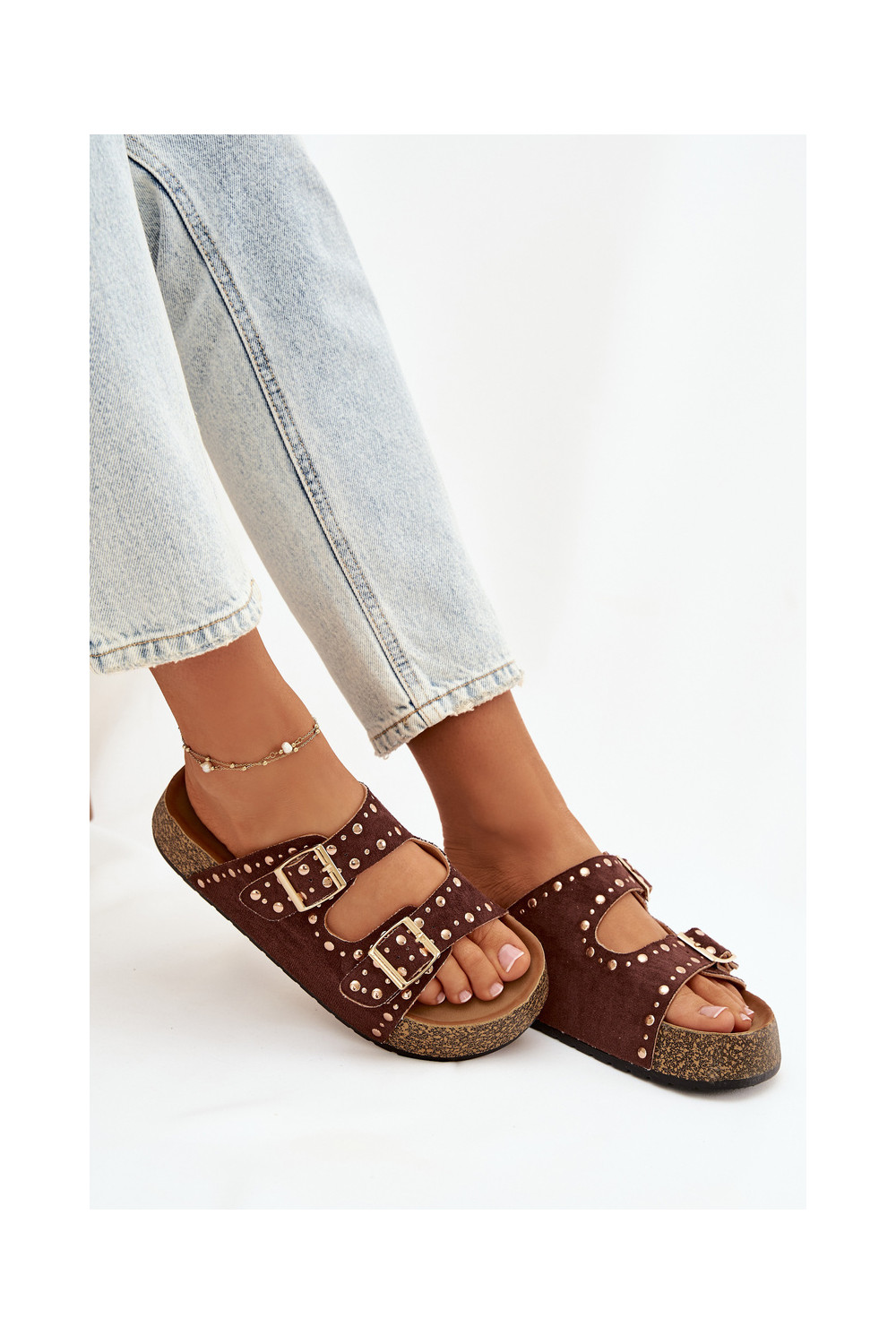 Naistel pruunid sussid kuldsete klambrite ja nupudega Tervina