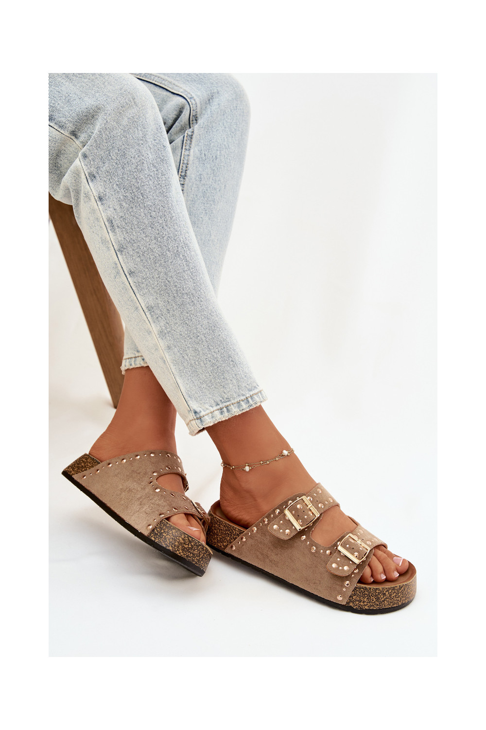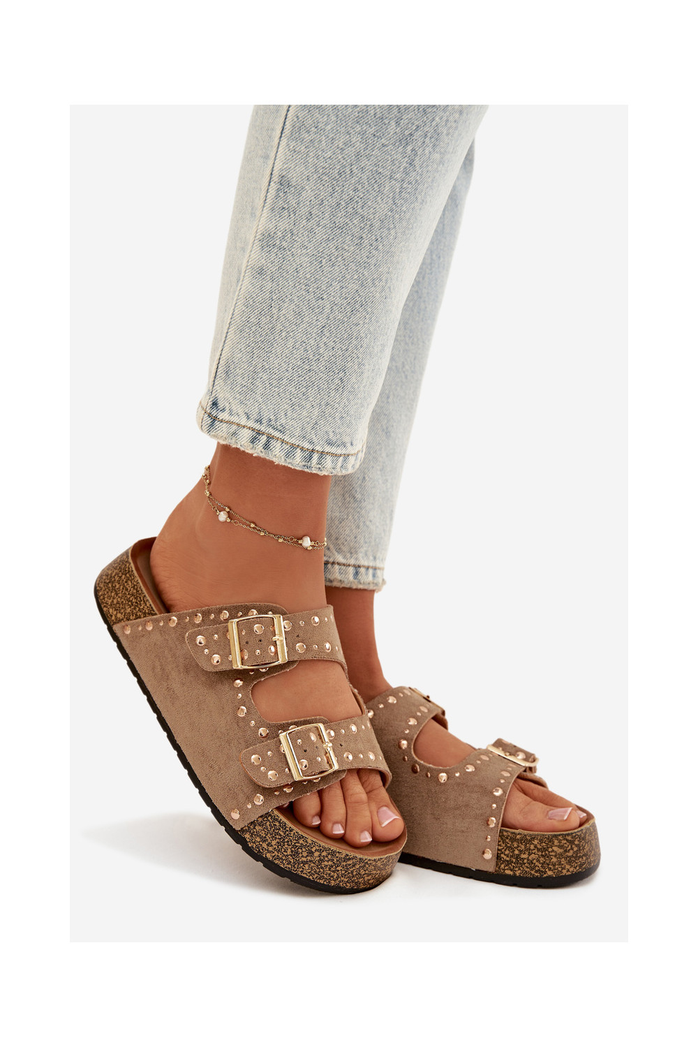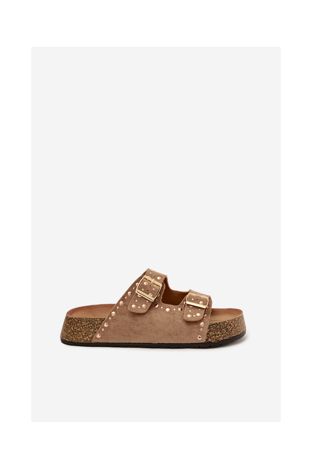 Klapki Damskie Ze Złotymi Klamrami I Ćwiekami Khaki Tervina