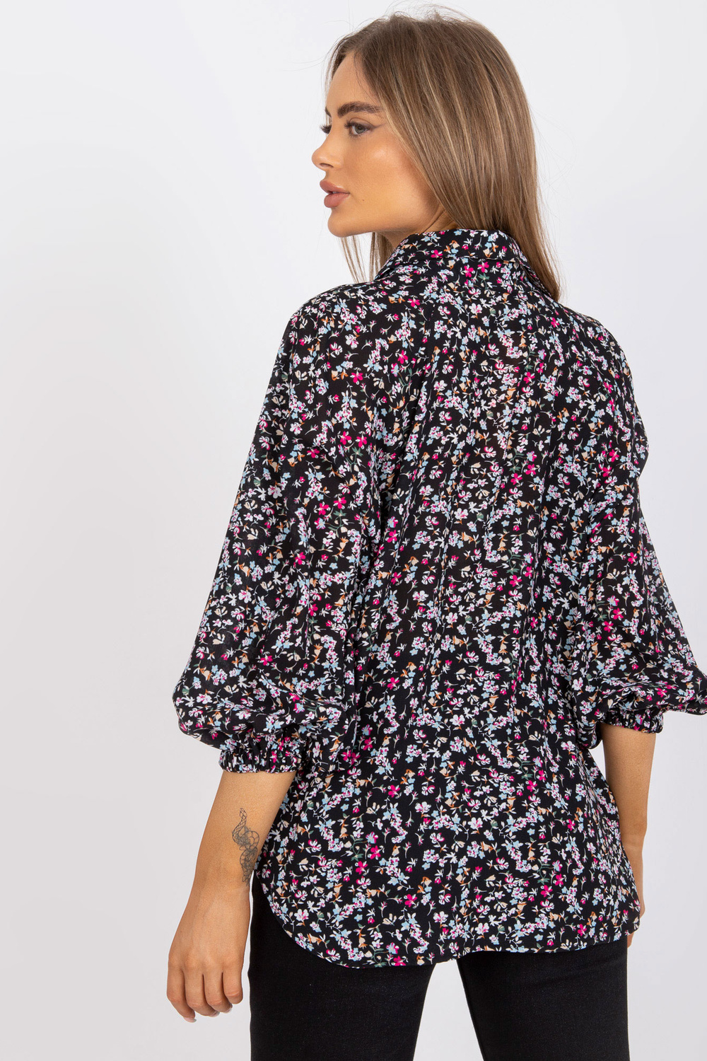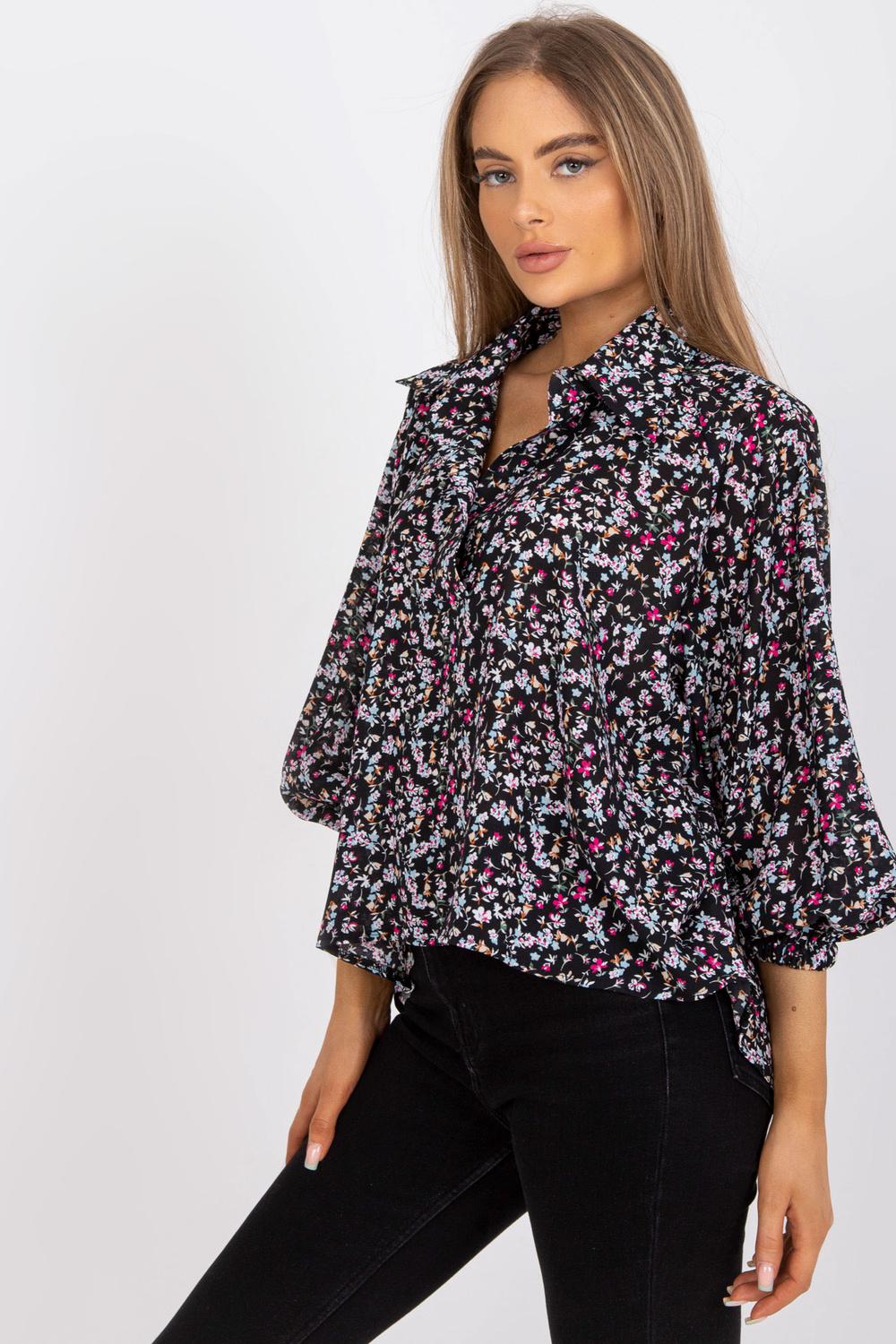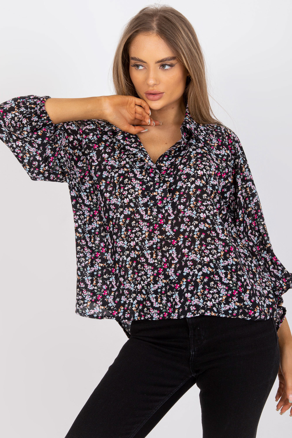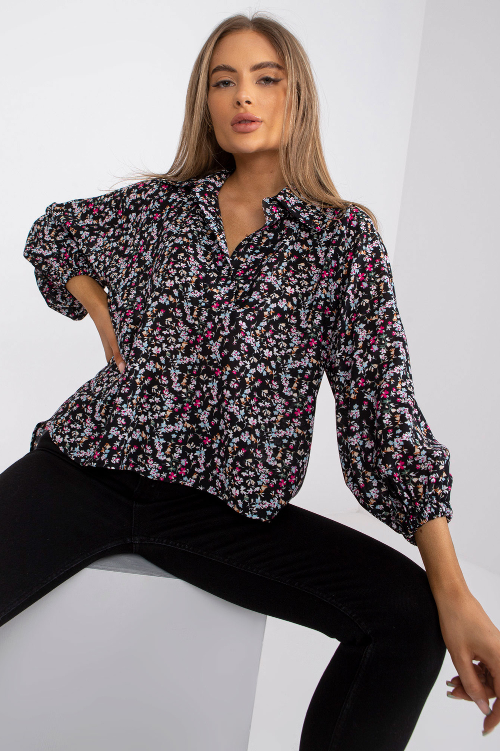 Must, avara lõikega pluus ZULUNA trükiga .