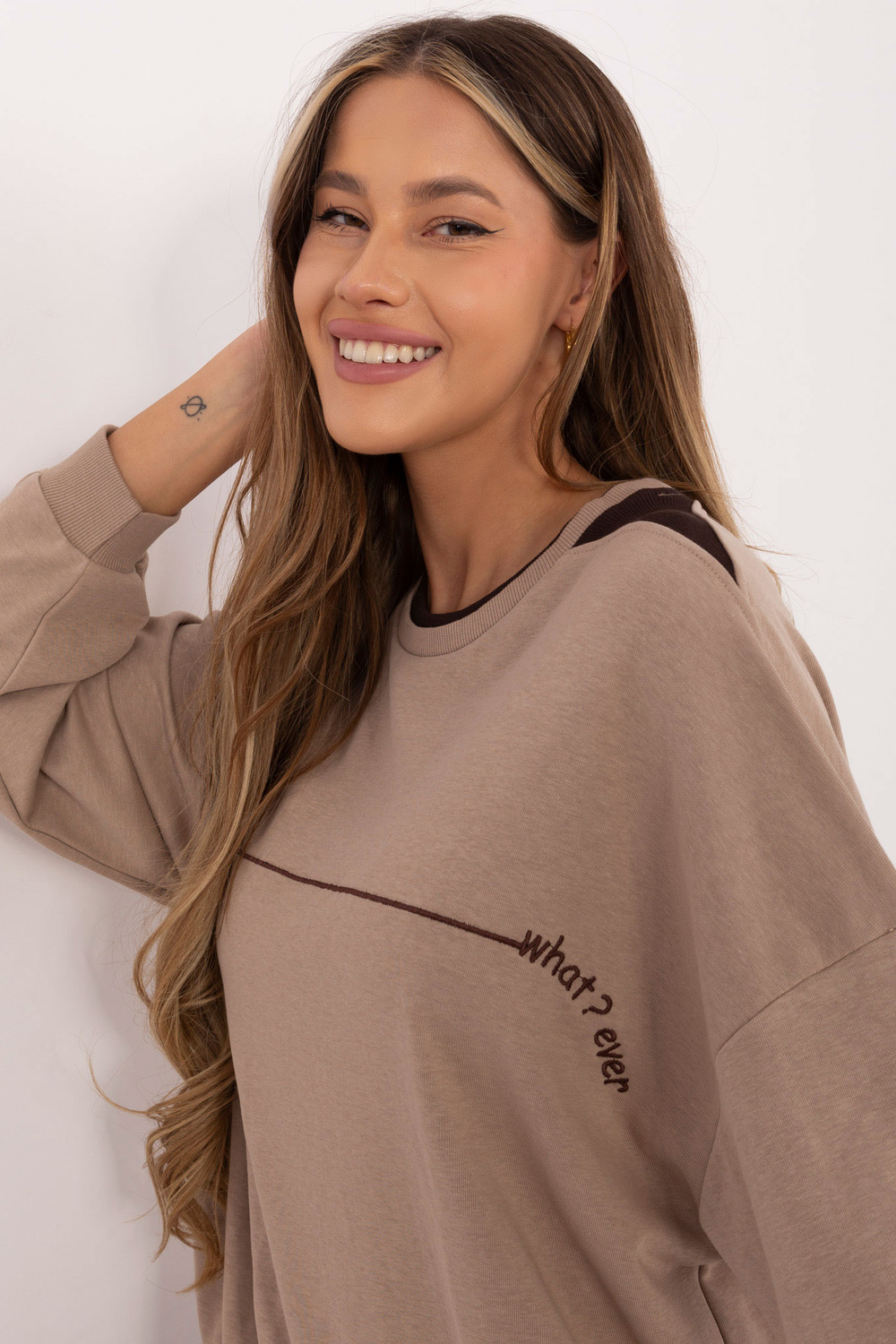 Ühe suurusega dressipluusi mõõdud lamades: laius kaenla all - 64 cm, varruka pikkus - 46 cm, laius puusade juures - 52 cm, kogupikkus - 68 cm.