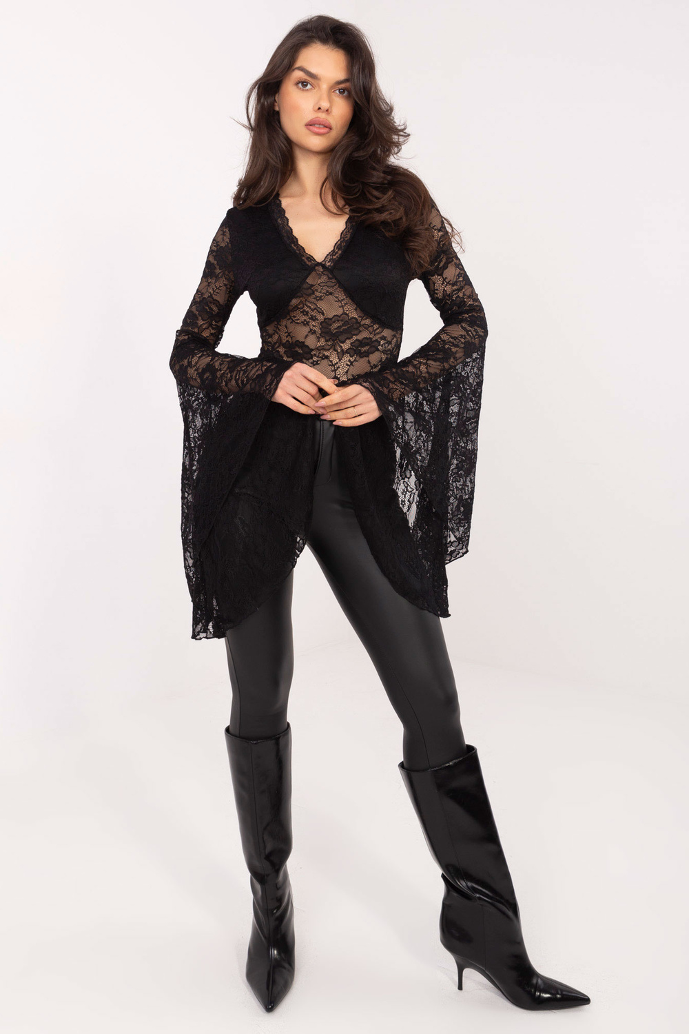 Model kannab ühe suurusega riiet. Modeli mõõtmed: pikkus 173 cm, rind 85 cm, talje 62 cm, puusad 95 cm.