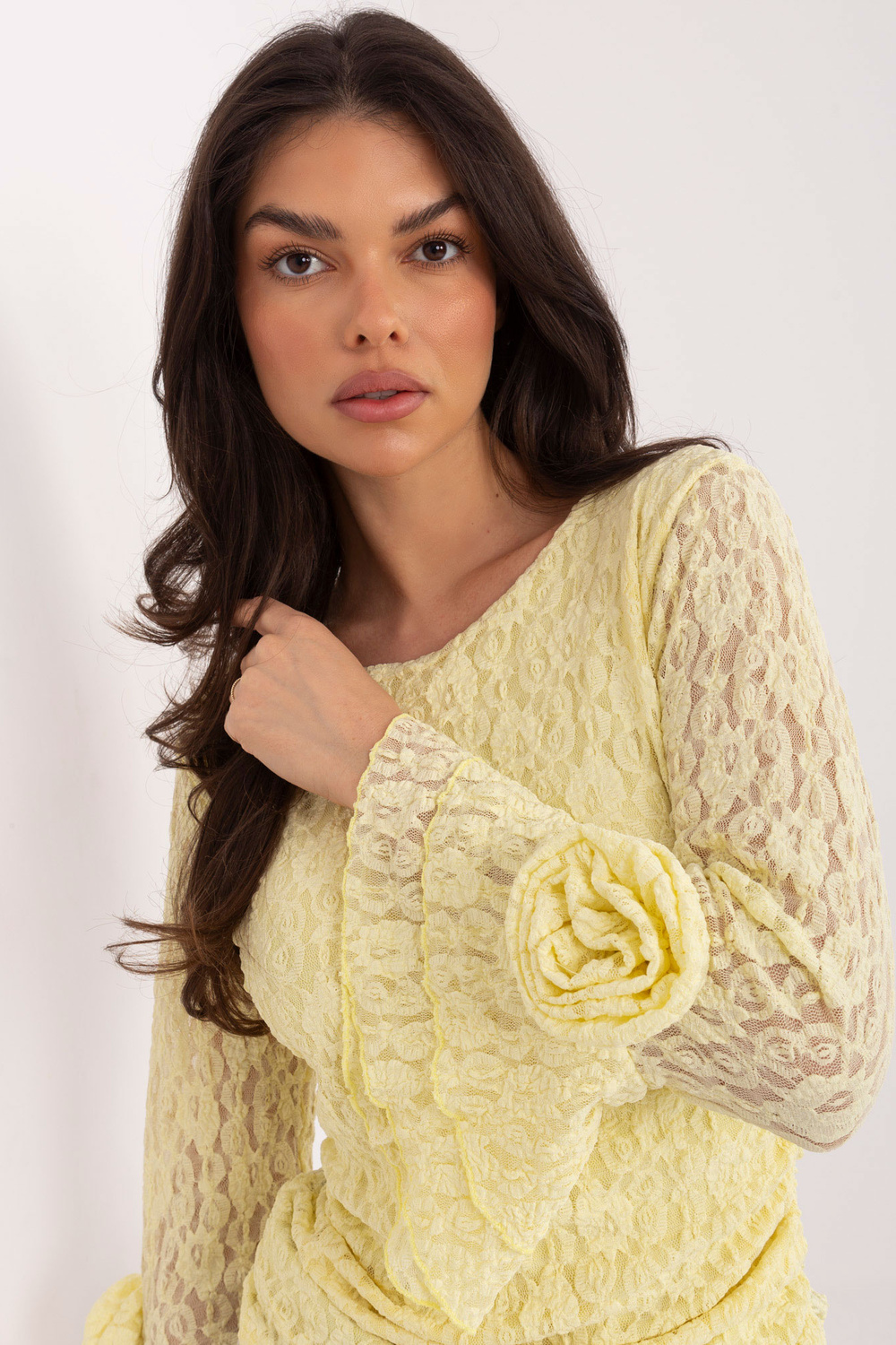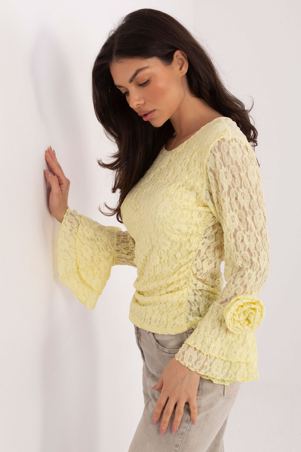 Ühesuuruse pluusi mõõdud lamades: laius kaenla alt - 70 cm, kogupikkus - 66 cm, laius puusadel - 48 cm, varruka pikkus - 69 cm.