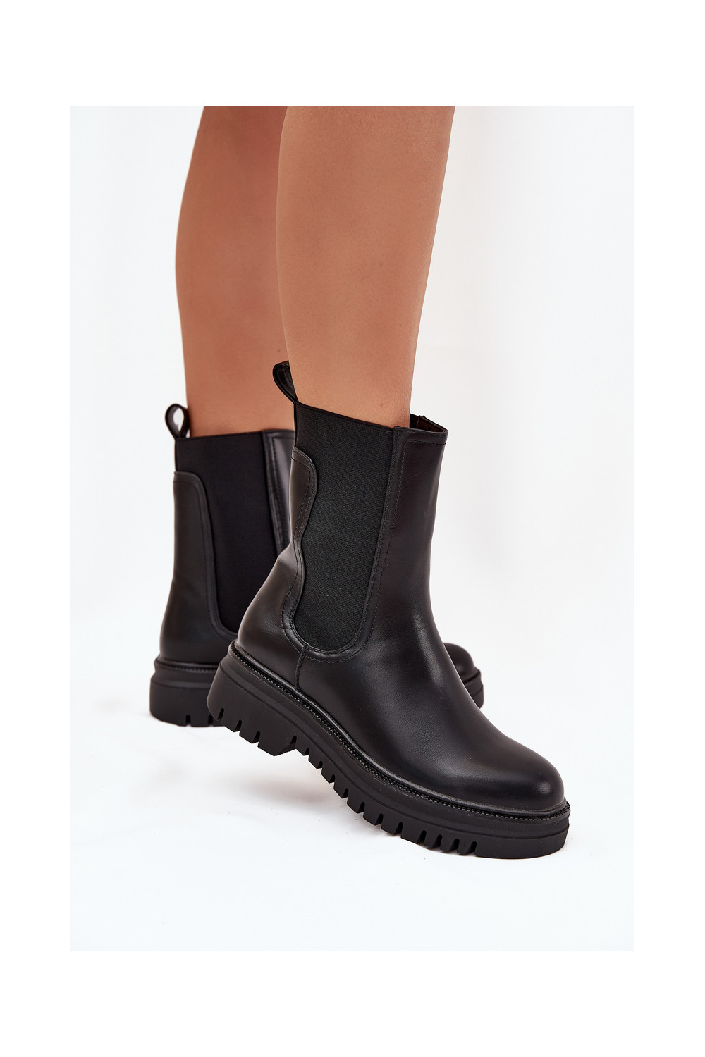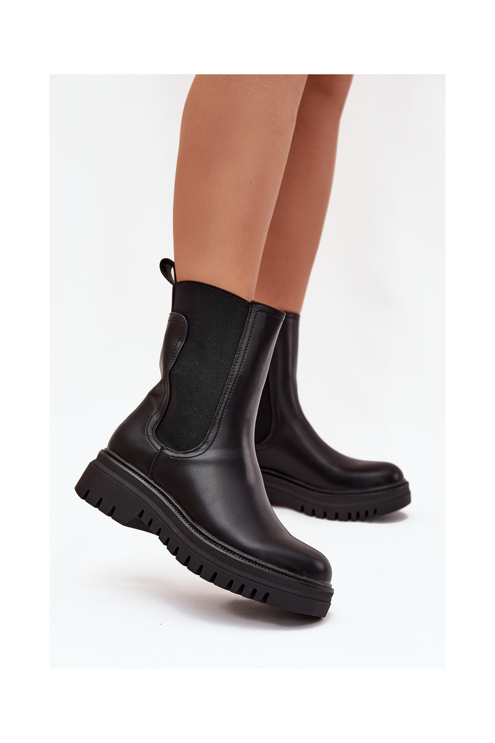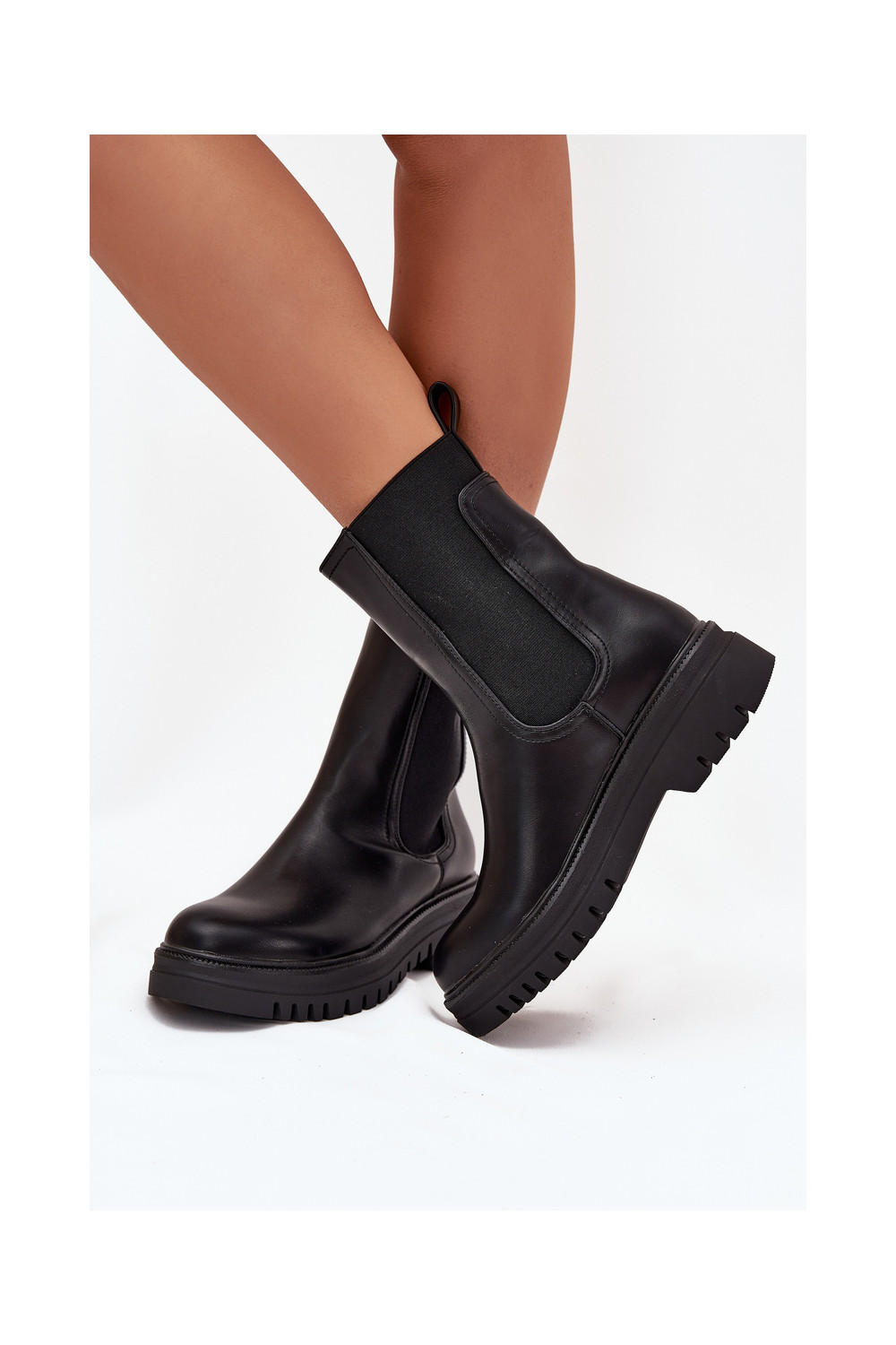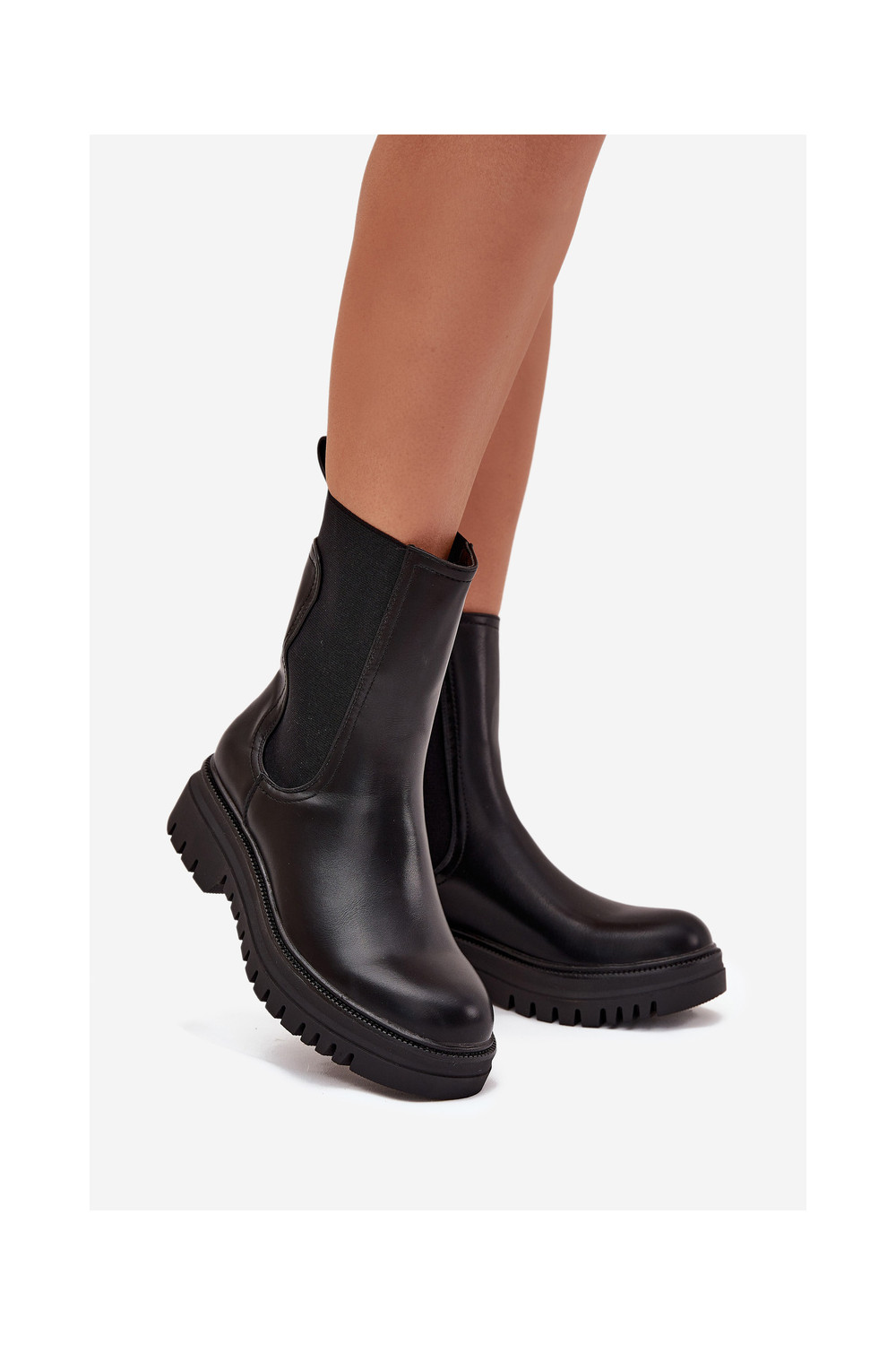 Stiilsed naiselikud saapad platvormiga ja madala kontsaga, sisseastumiseks mudel, musta värviga Ravessa