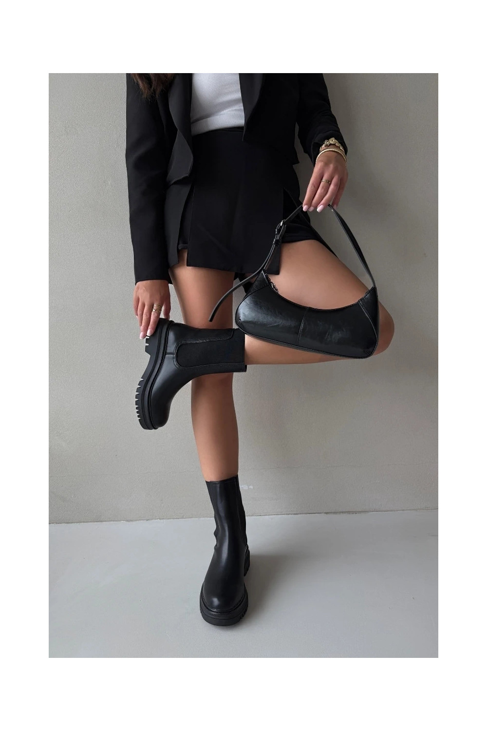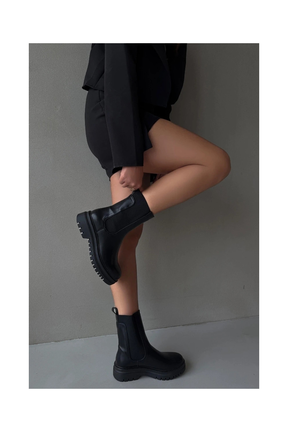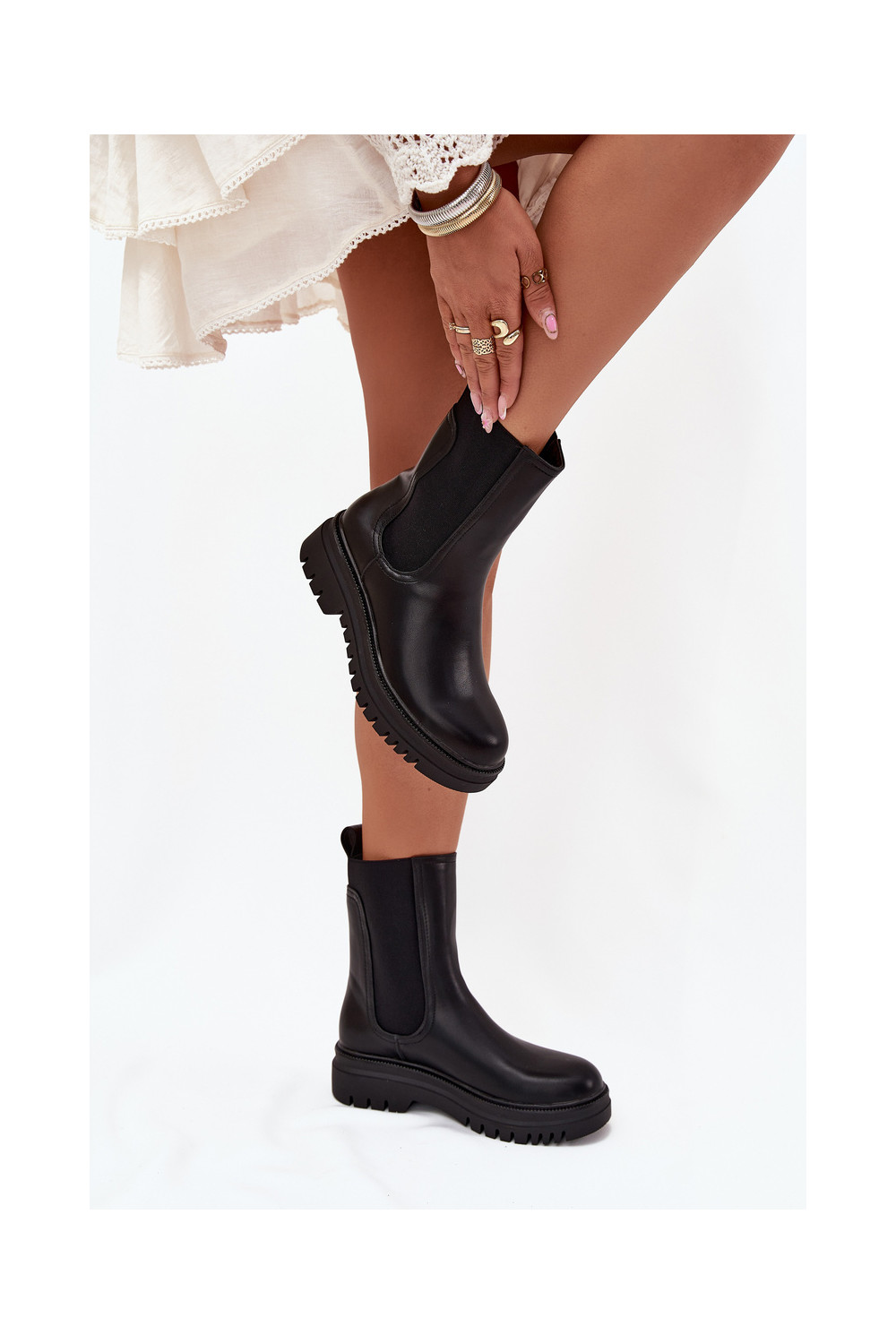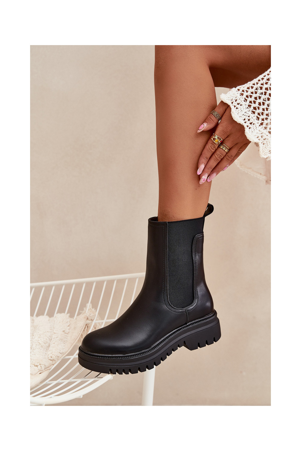 Stiilsed naiselikud saapad platvormiga ja madala kontsaga, sisseastumiseks mudel, musta värviga Ravessa