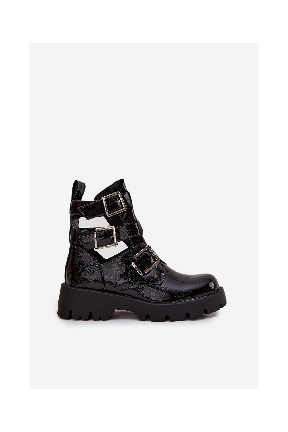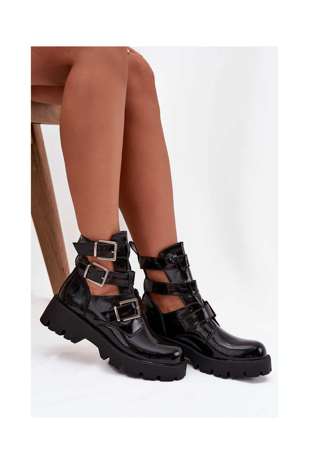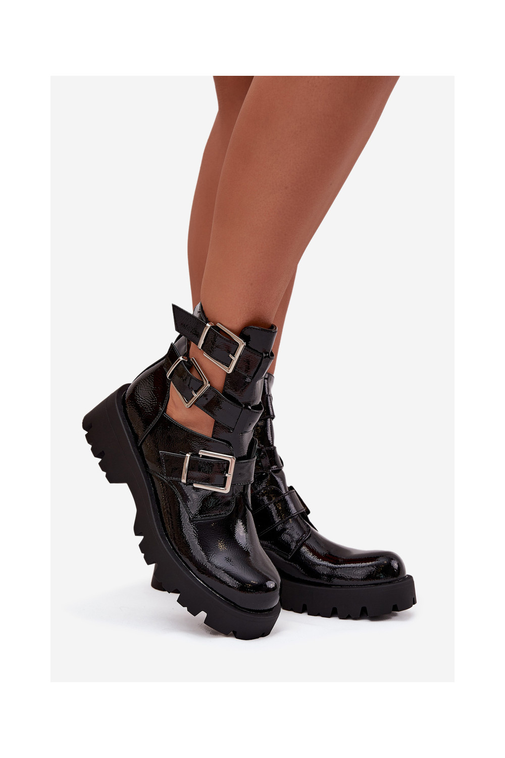 Läikivad naiste saapad rihmadega, hõbedaste kinnitustega, musta värvi "Helisse"