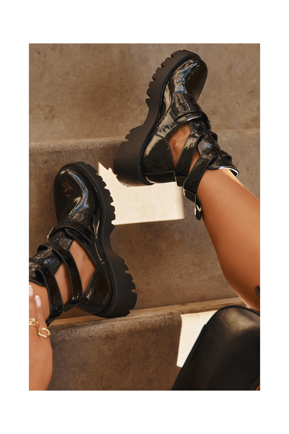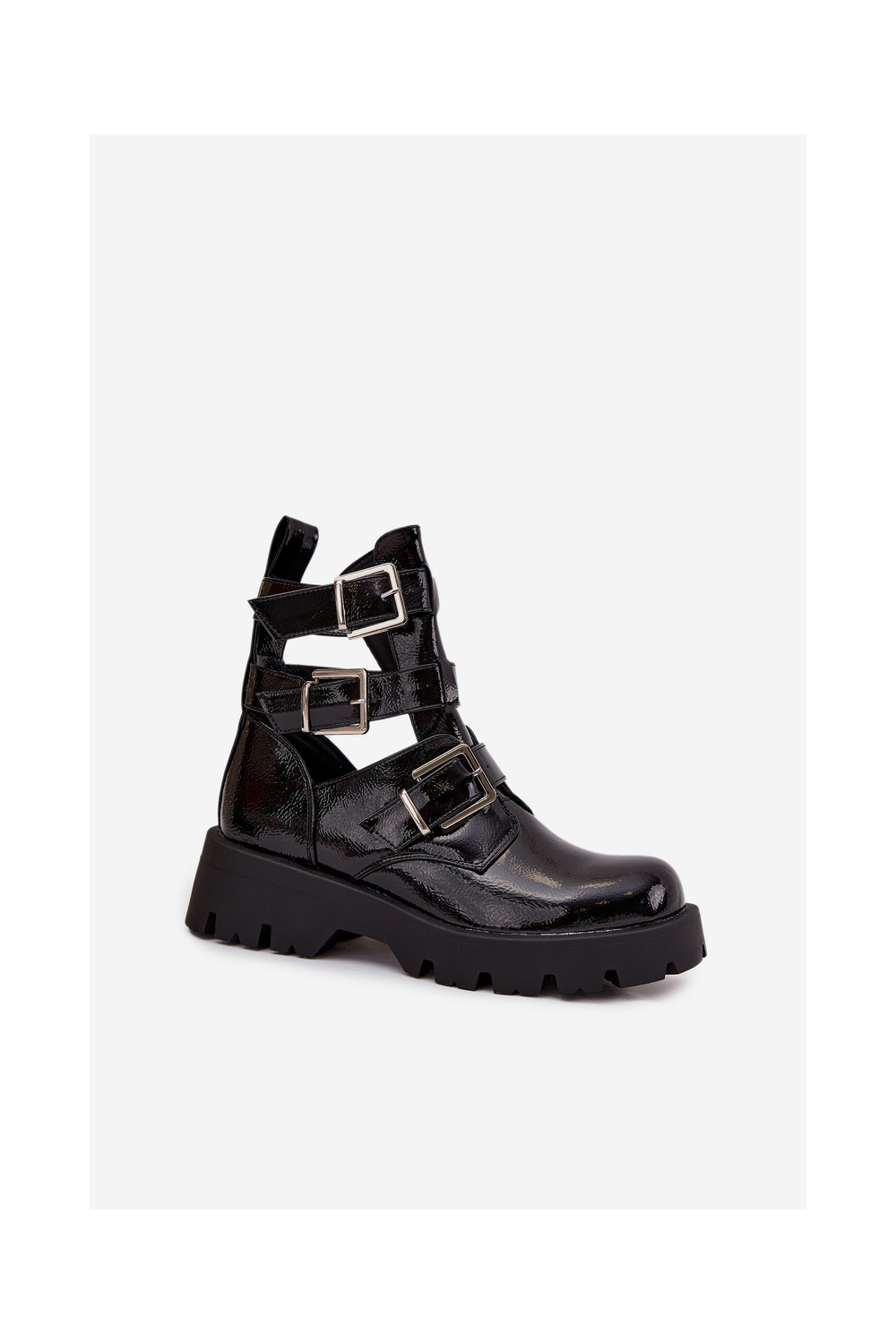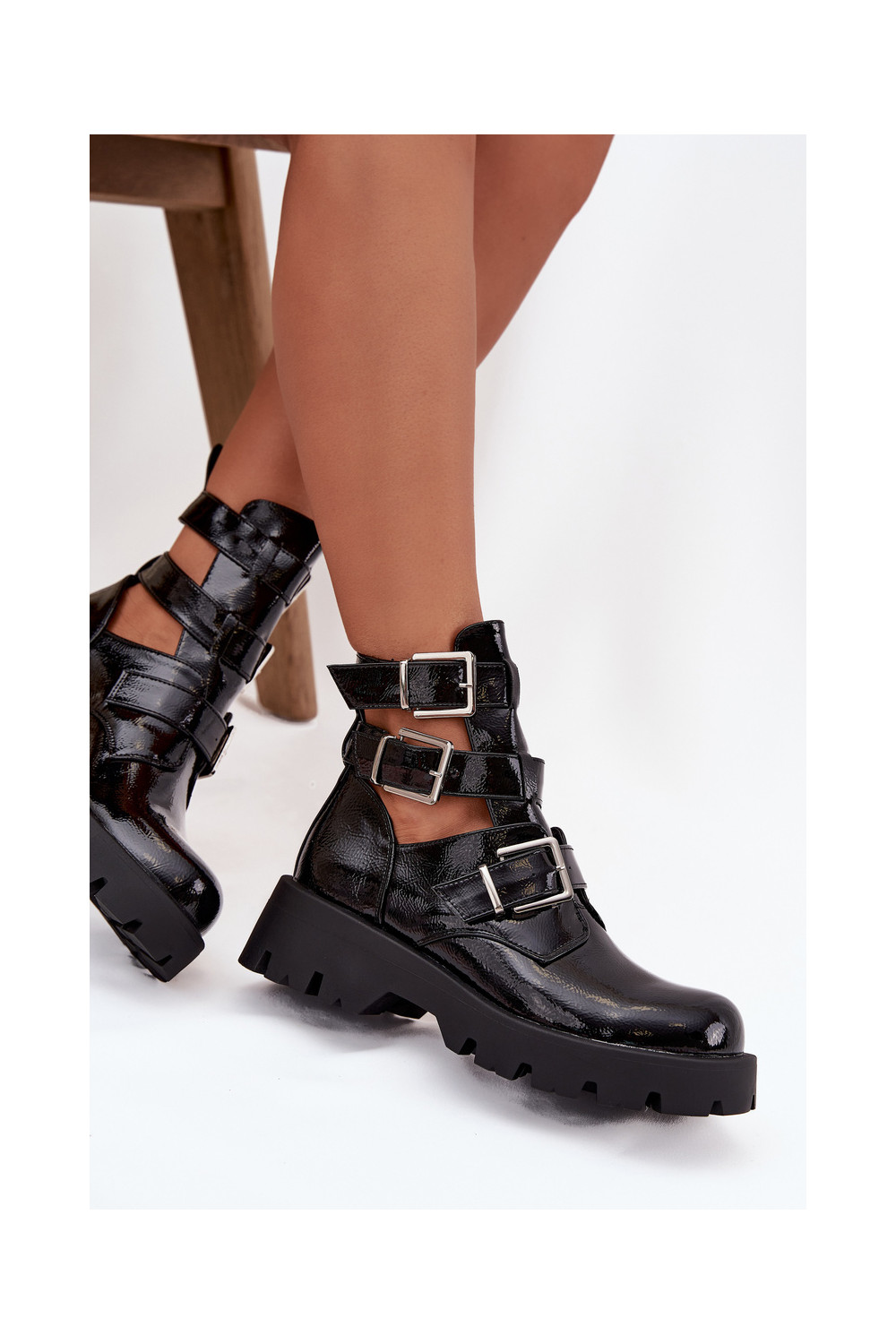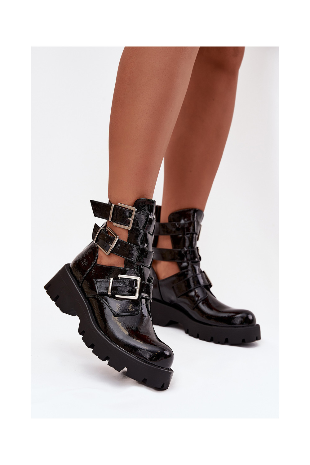 Läikivad naiste saapad rihmadega, hõbedaste kinnitustega, musta värvi "Helisse"