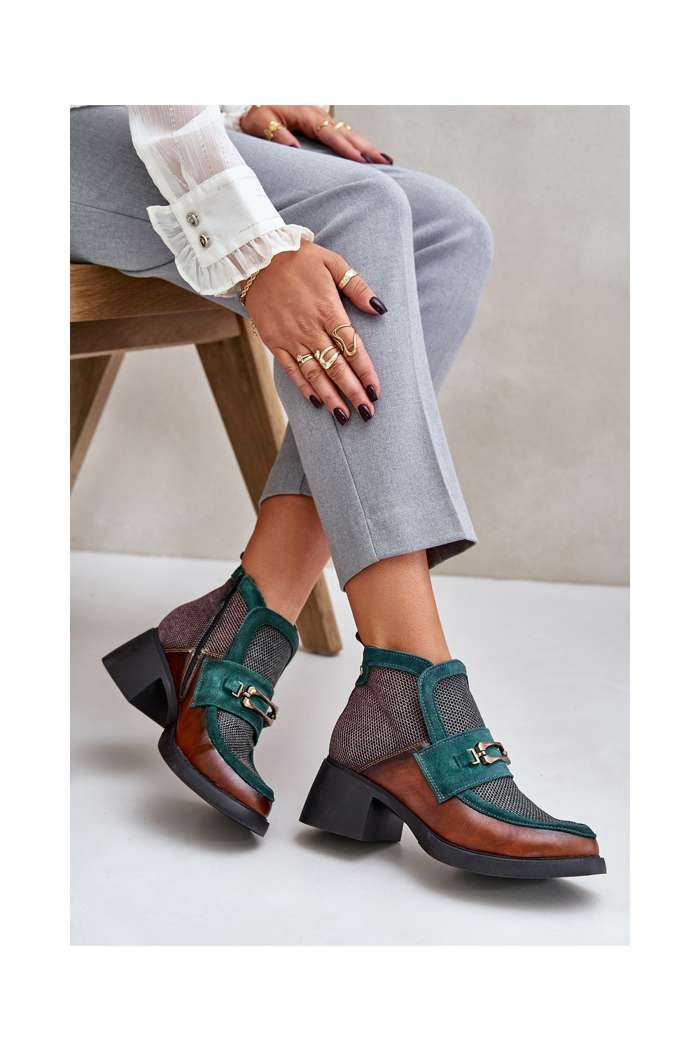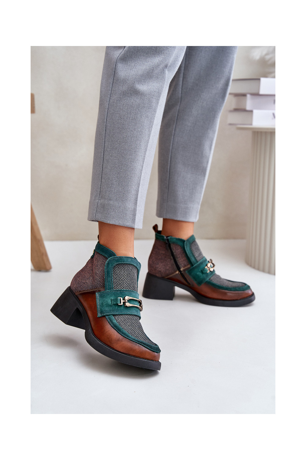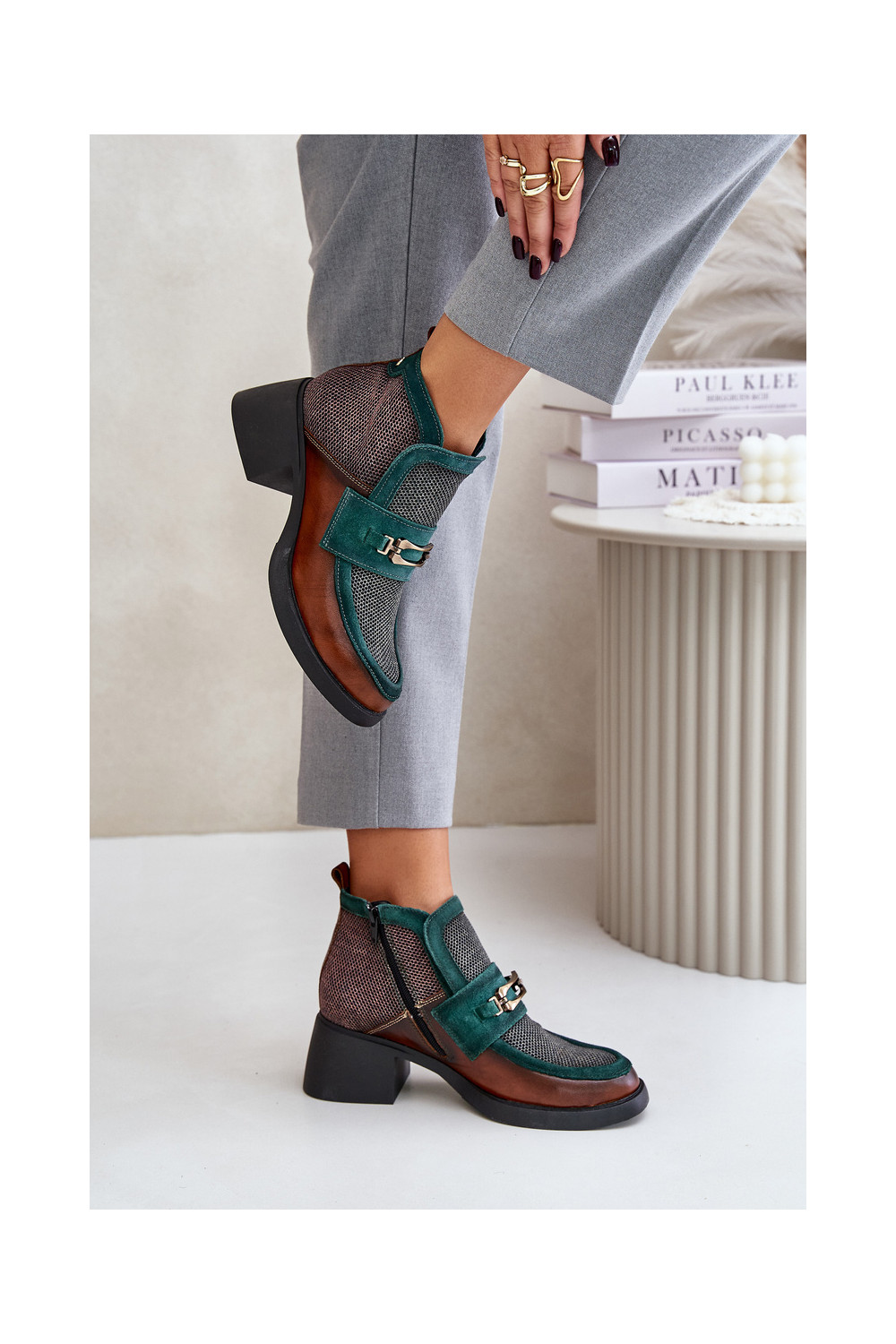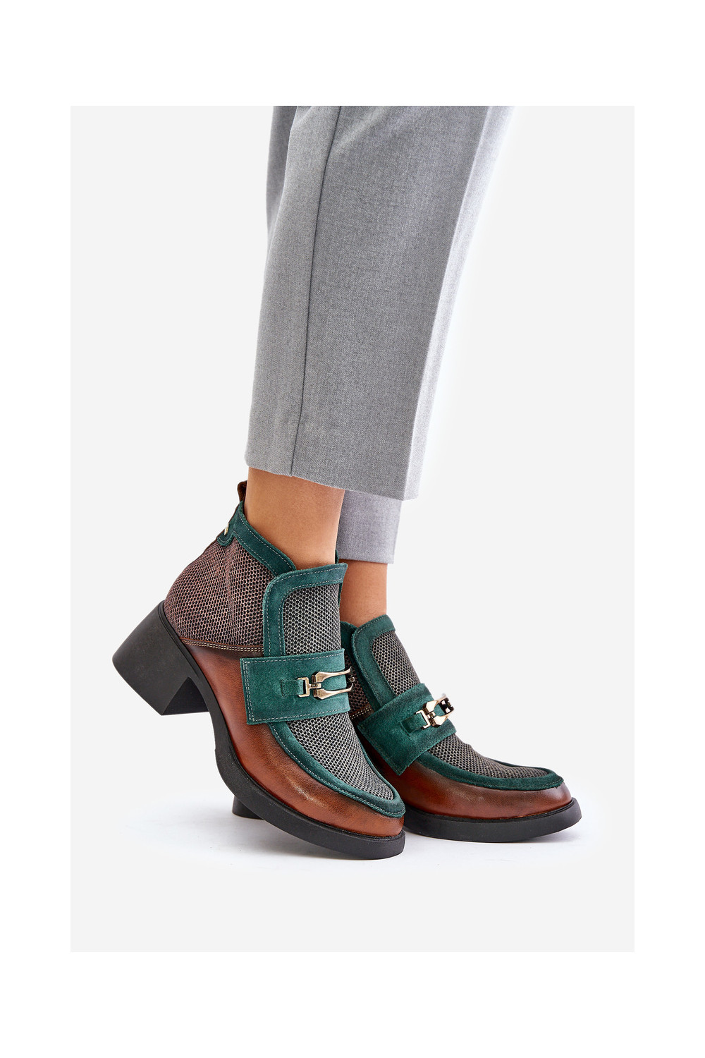 Nahast naiste kingad paksu kontsaga ornamentidega "Tai turiciejka" A6747-29 pruun-rohelise värviga