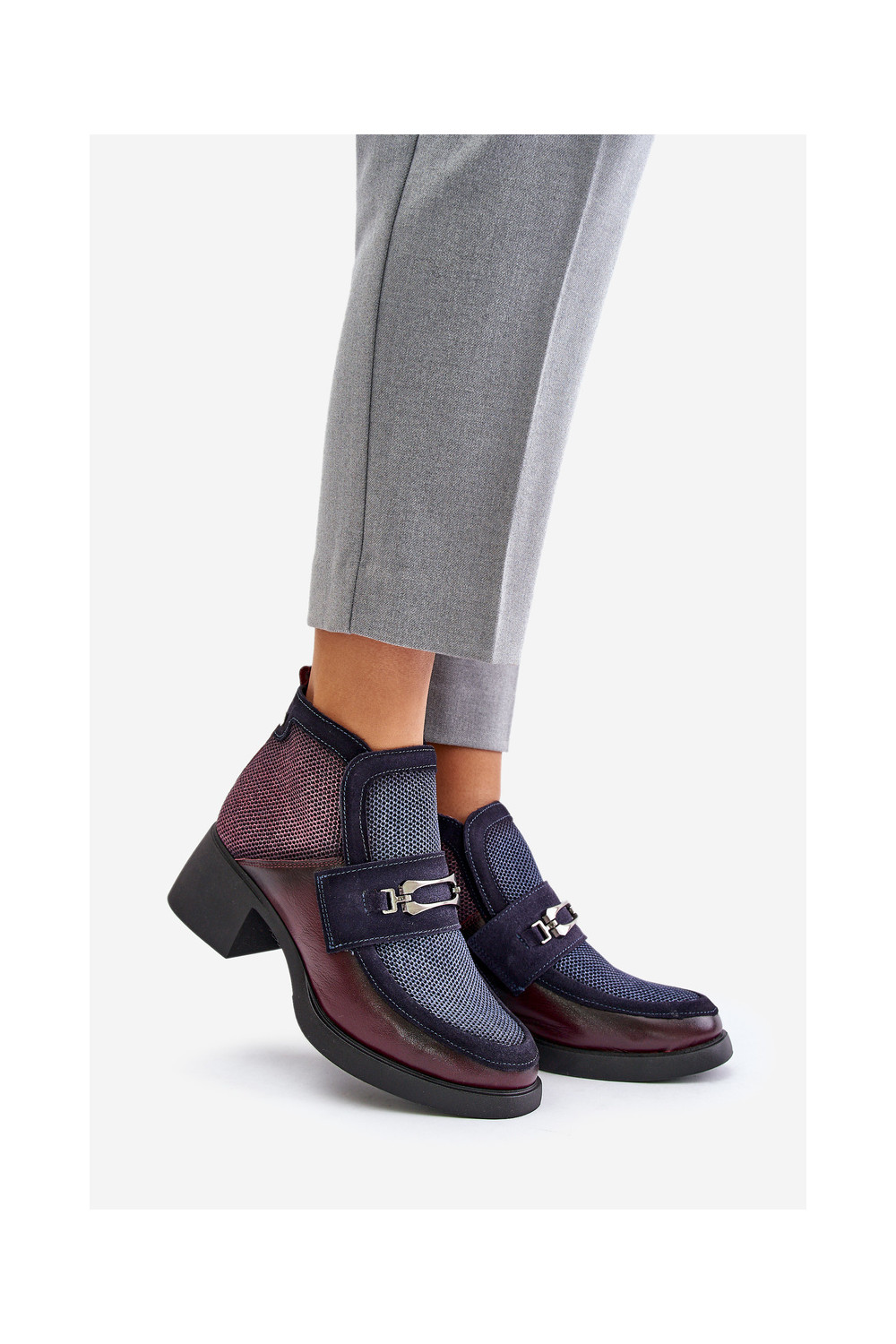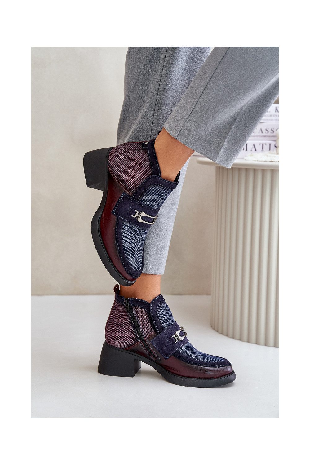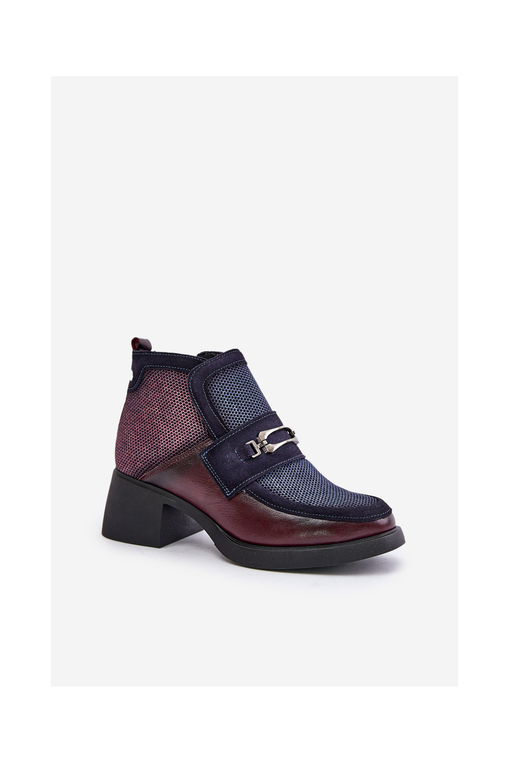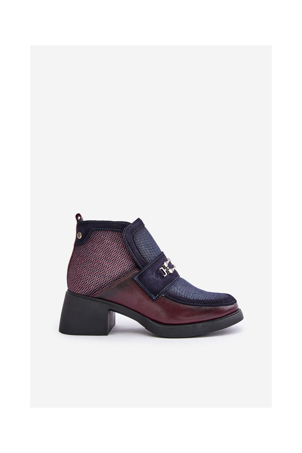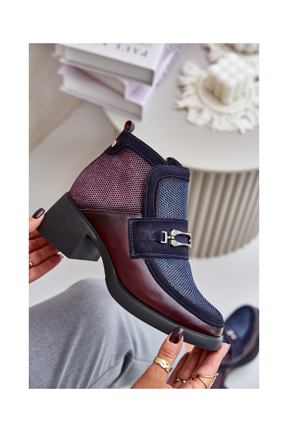 Nahast naiste kingad paksu kontsaga ornamentidega "Tai turiciejka" A6747-23 bordoo-tumesinise värviga