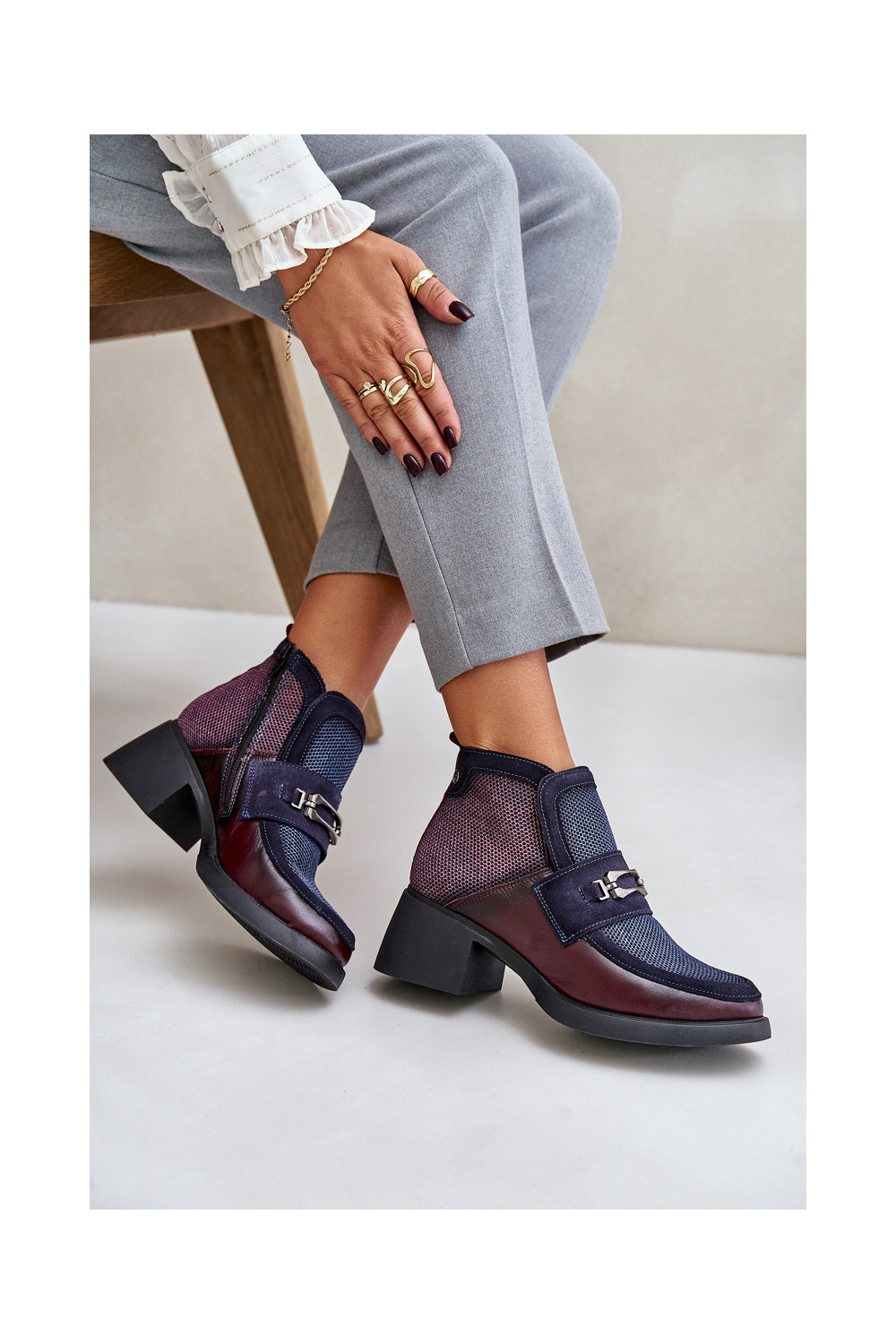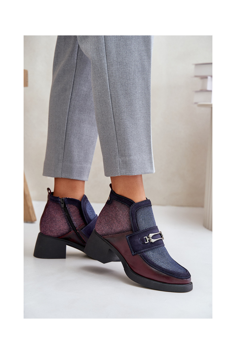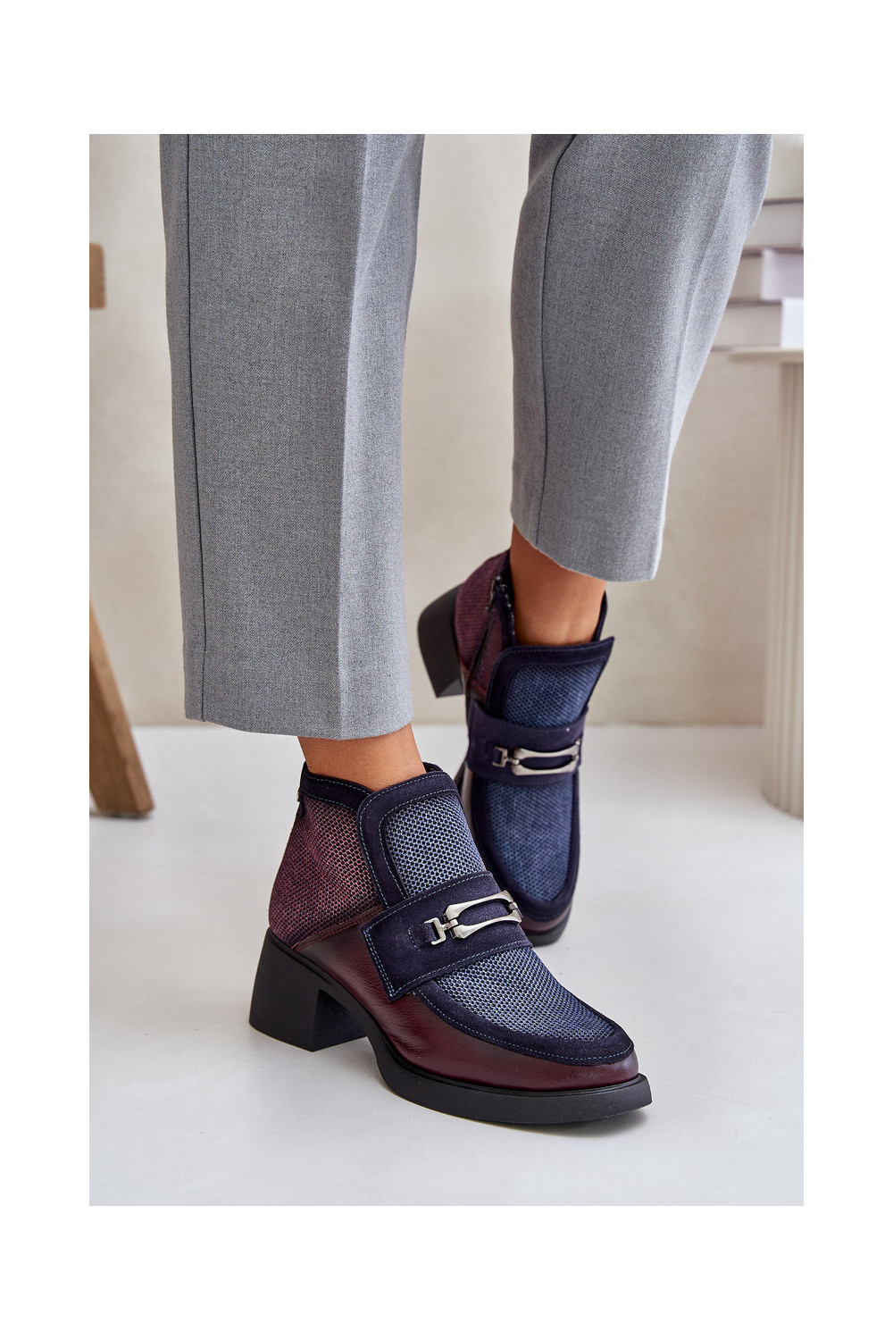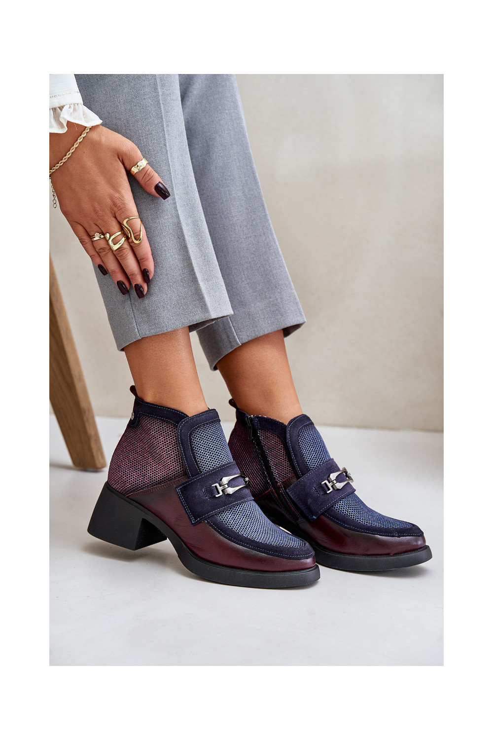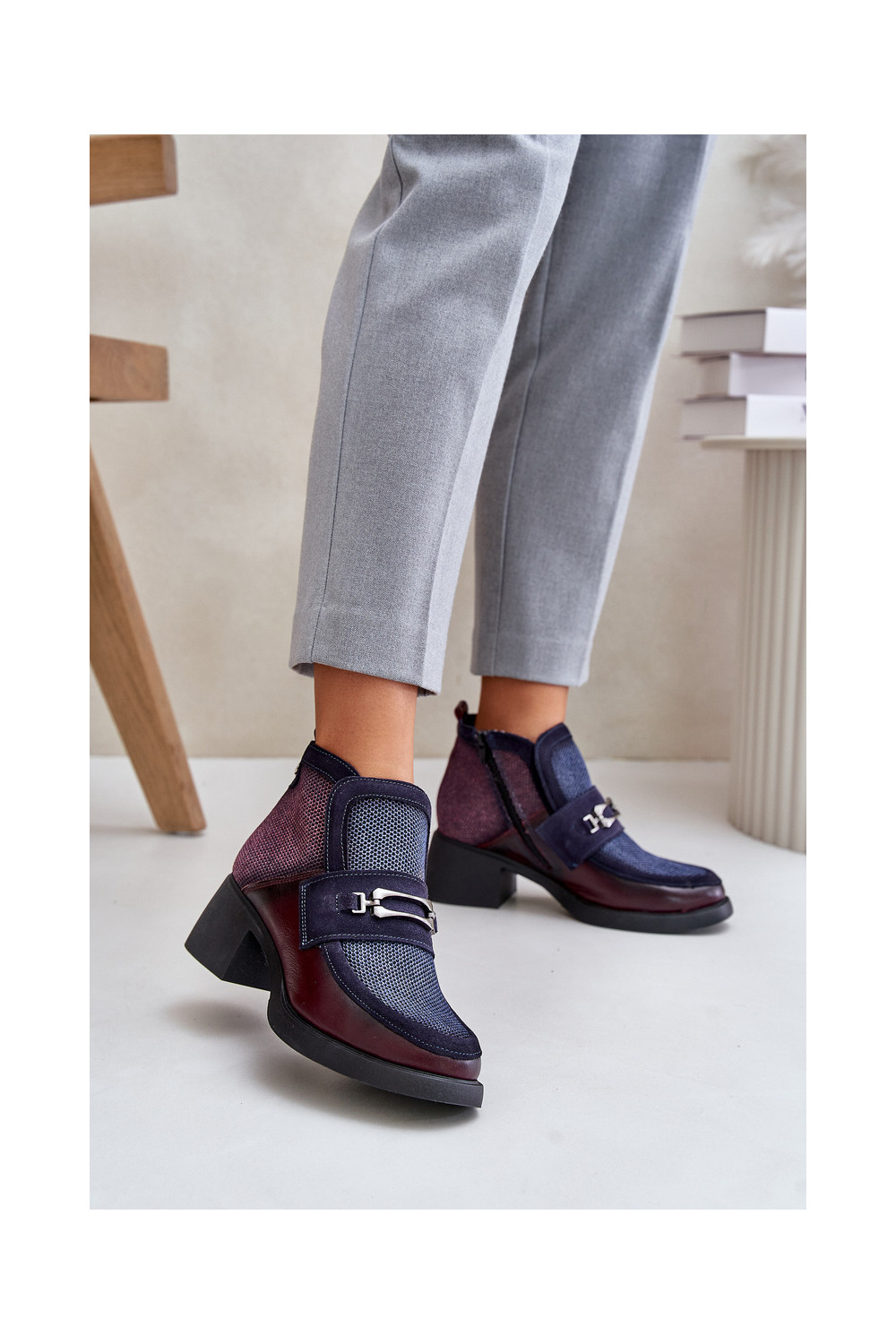 Nahast naiste kingad paksu kontsaga ornamentidega "Tai turiciejka" A6747-23 bordoo-tumesinise värviga
