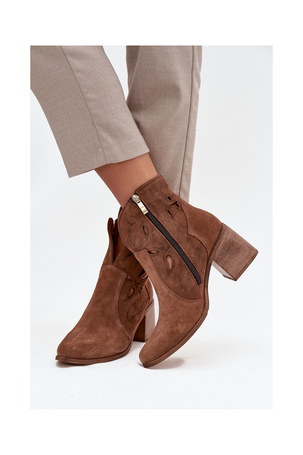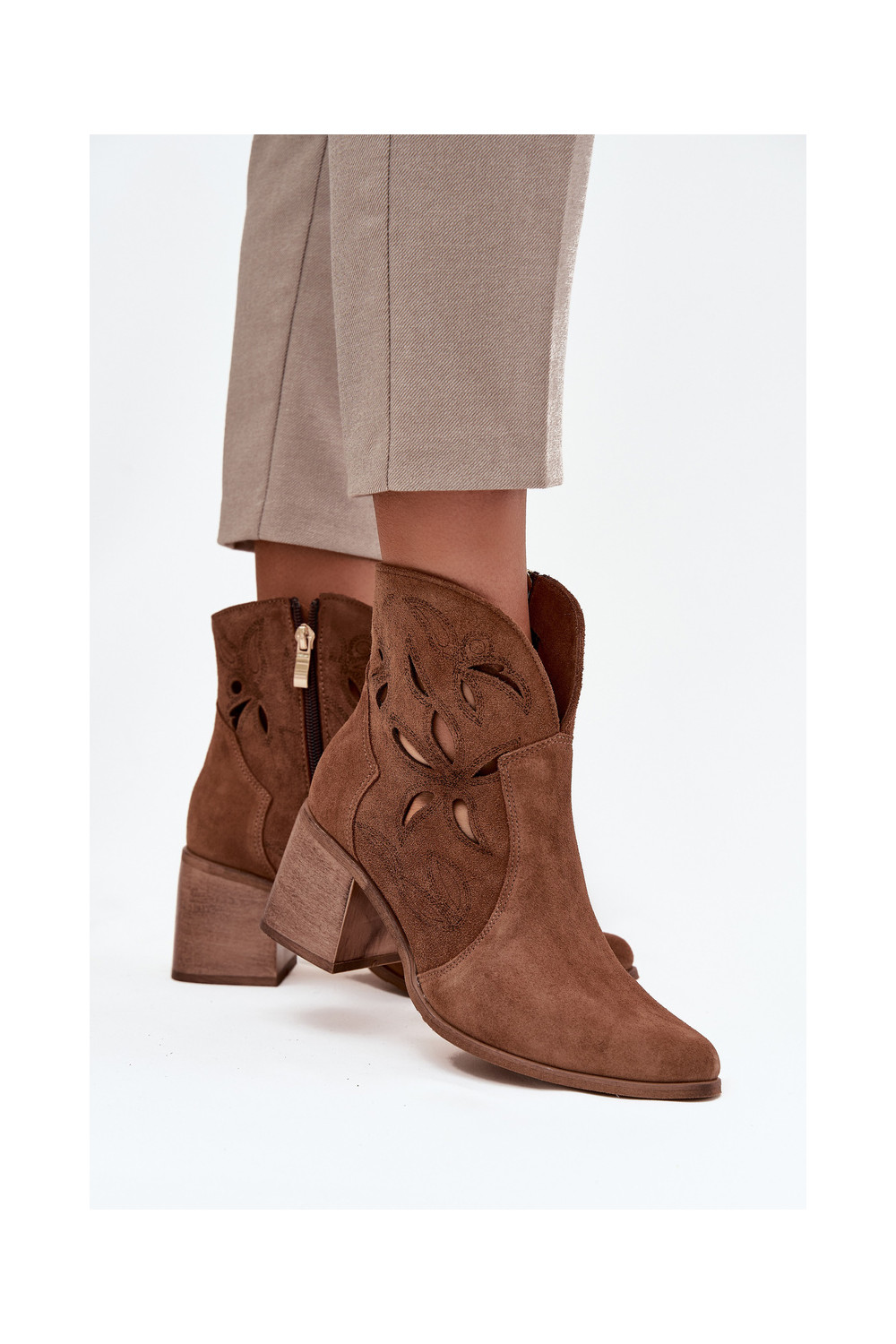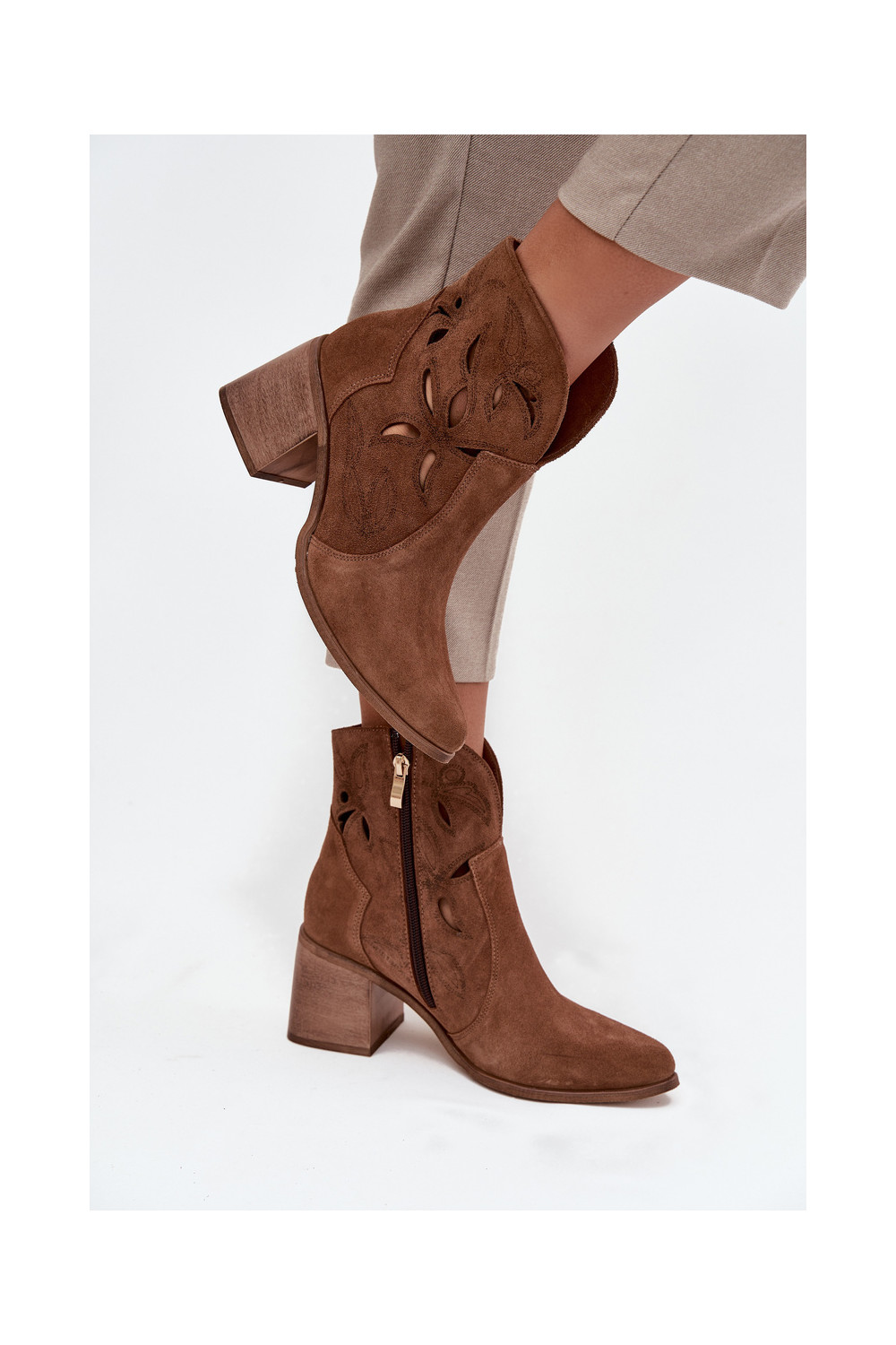Naiste saapad aukude elementidega naturaalsest seemisnahast kontsadega Zazoo 3690 pruunid