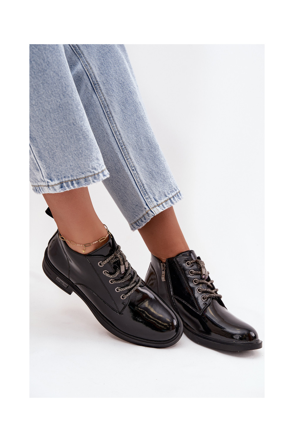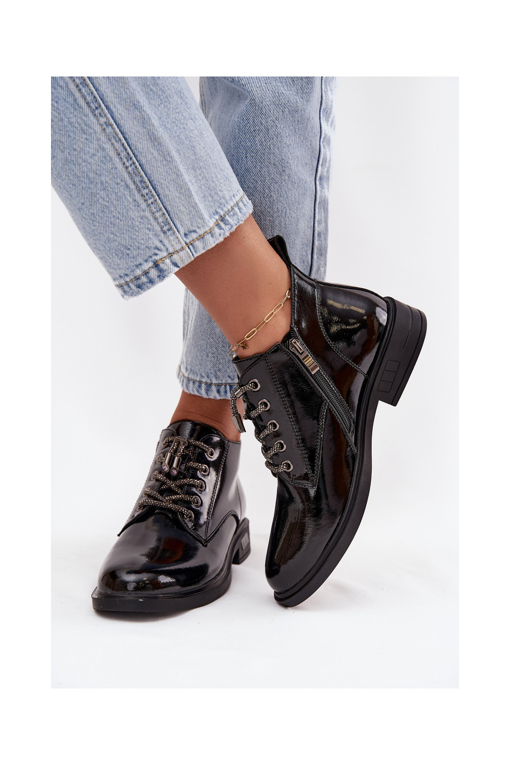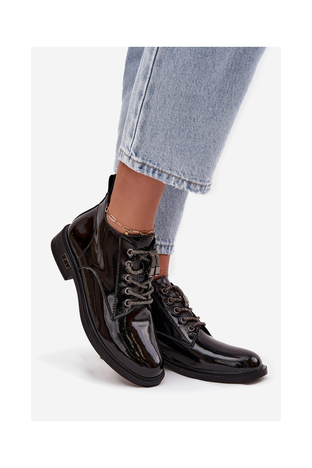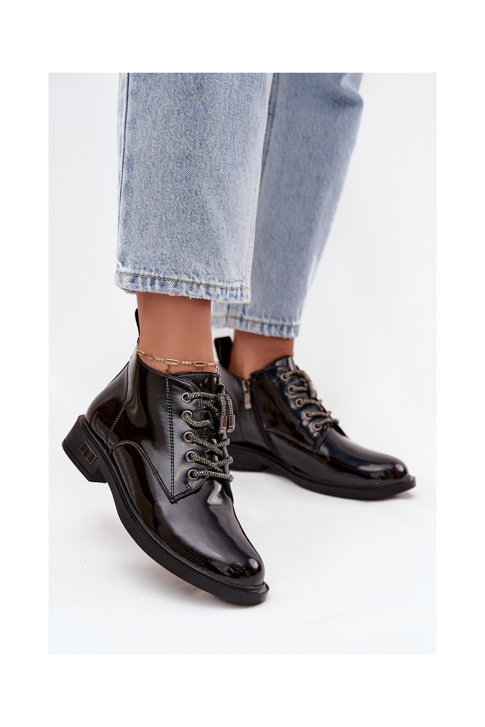 Kunstnahast naiste saapad lakiefektiga ja uhkete nööridega D&A MR52-124 musta värvi