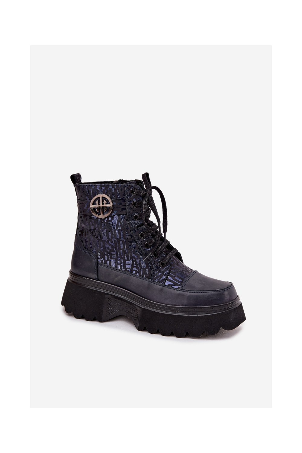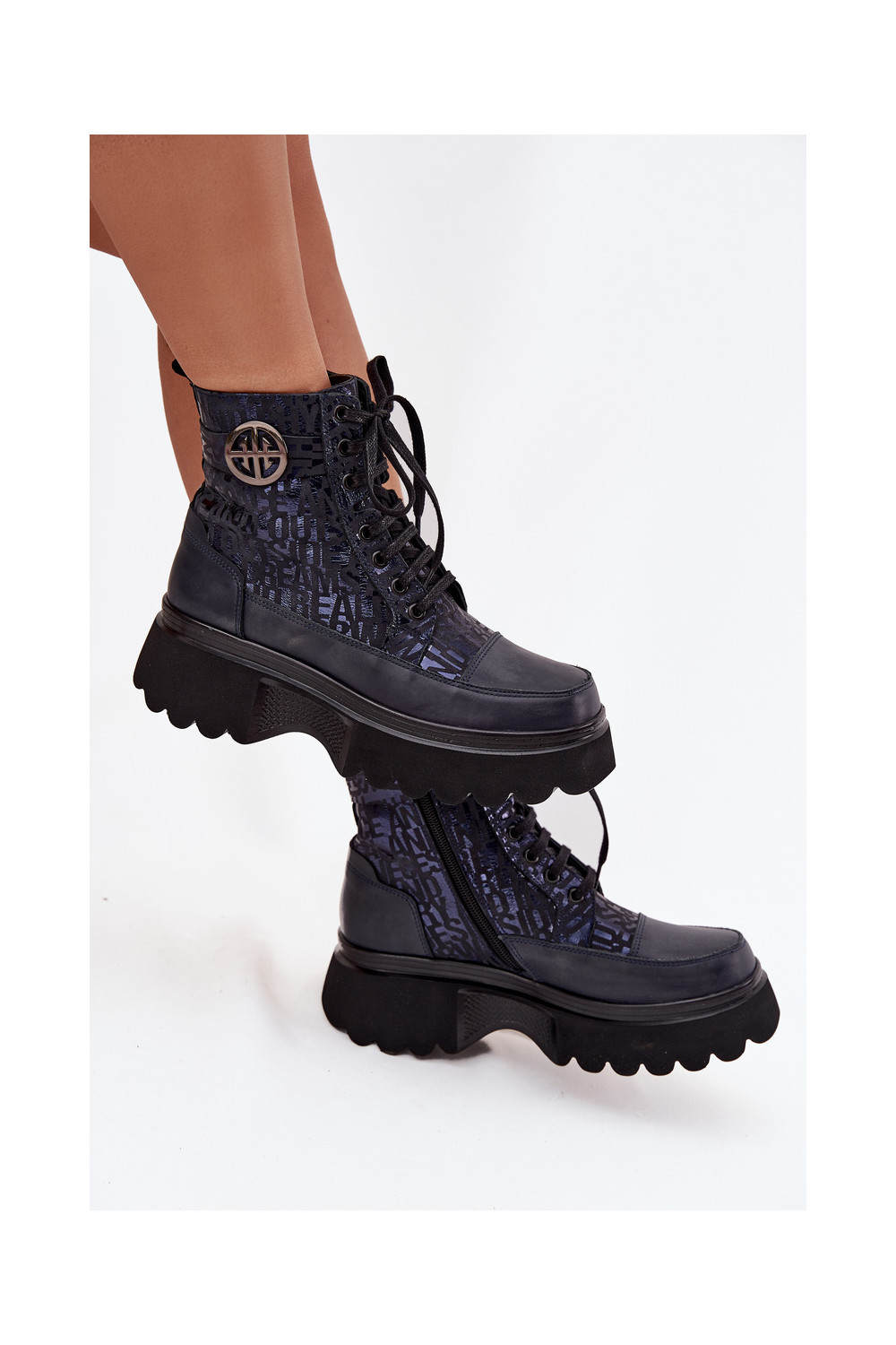 Leather Women's Platform Boots with Texts and Decorative Detail Artiker 57C2271 Navy Blue