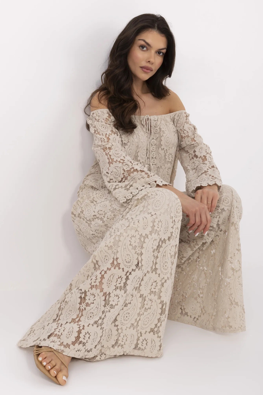 Modell kannab suurust üks. Modelli mõõdud: kõrgus 173 cm, rinnaümbermõõt 85 cm, talje 62 cm, puusad 95 cm.