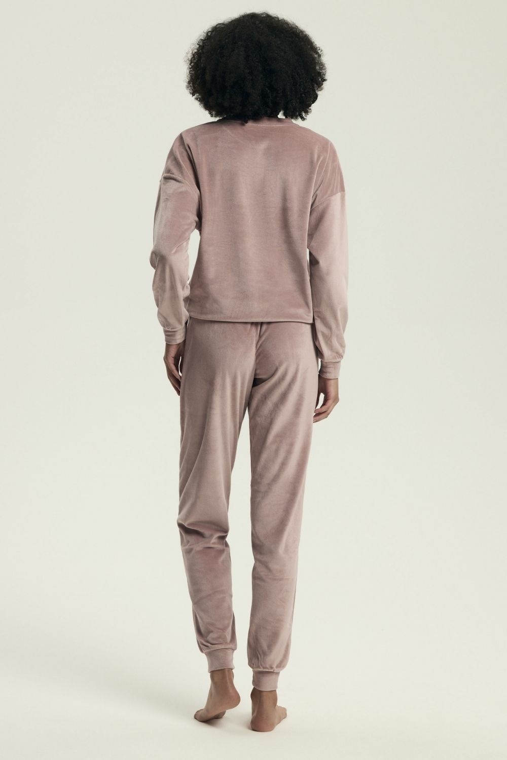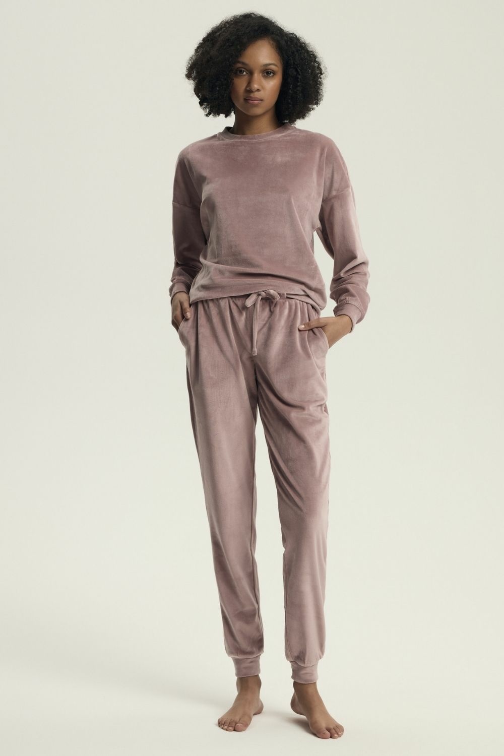 Comfortable tracksuit set with a loose, comfortable cut, perfect for everyday wear and as homewear. The long-sleeved sweatshirt with ribbed cuffs provides freedom of movement and a sporty look. Long pants with slip pockets, a wide elastic waistband, and drawstrings at the waist ensure a perfect fit and comfort. The cuffs at the bottom of the legs give the outfit a modern, casual character. An ideal set for relaxation, walks, or casual everyday styling.