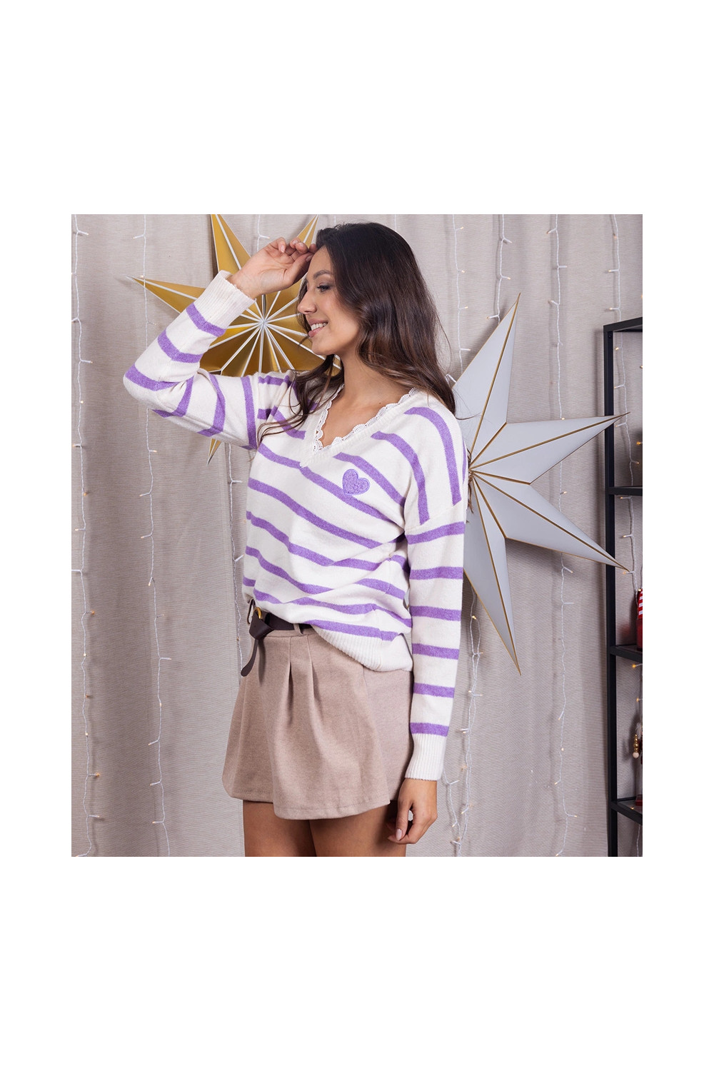 Lilla triibuline kampsun, mis on kaunistatud Anel plaastriga
