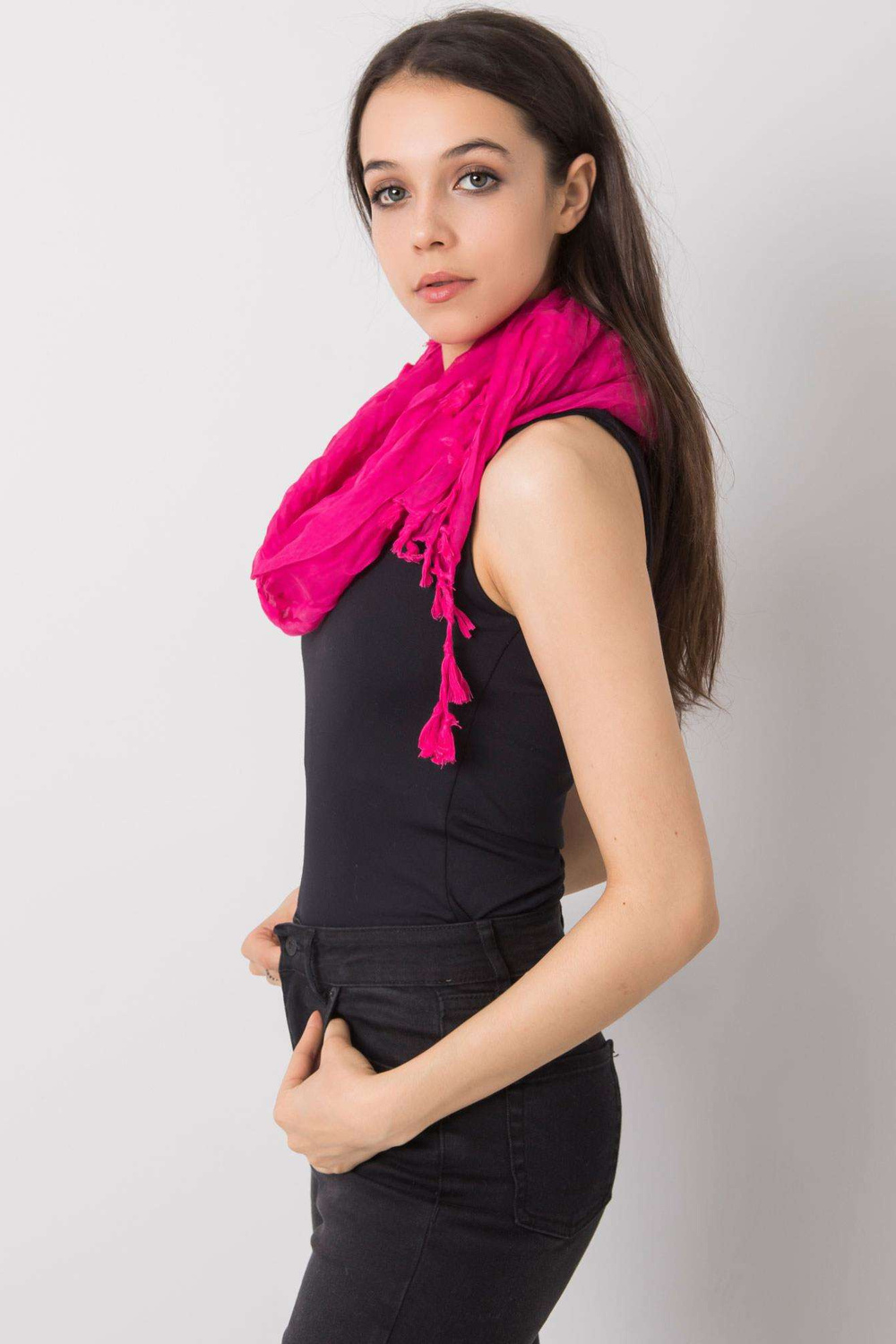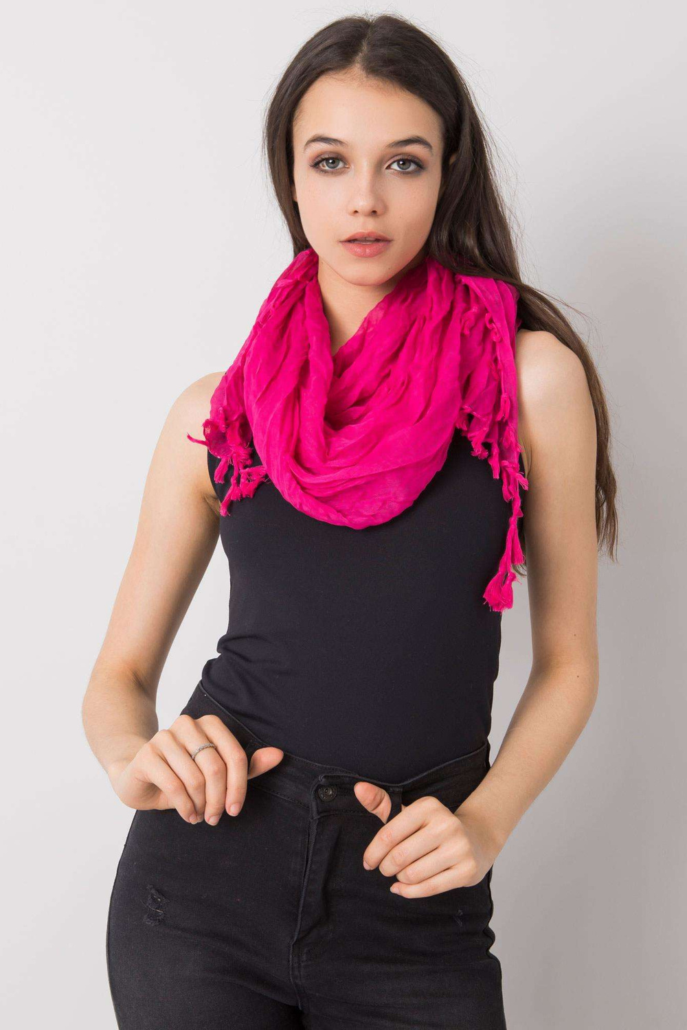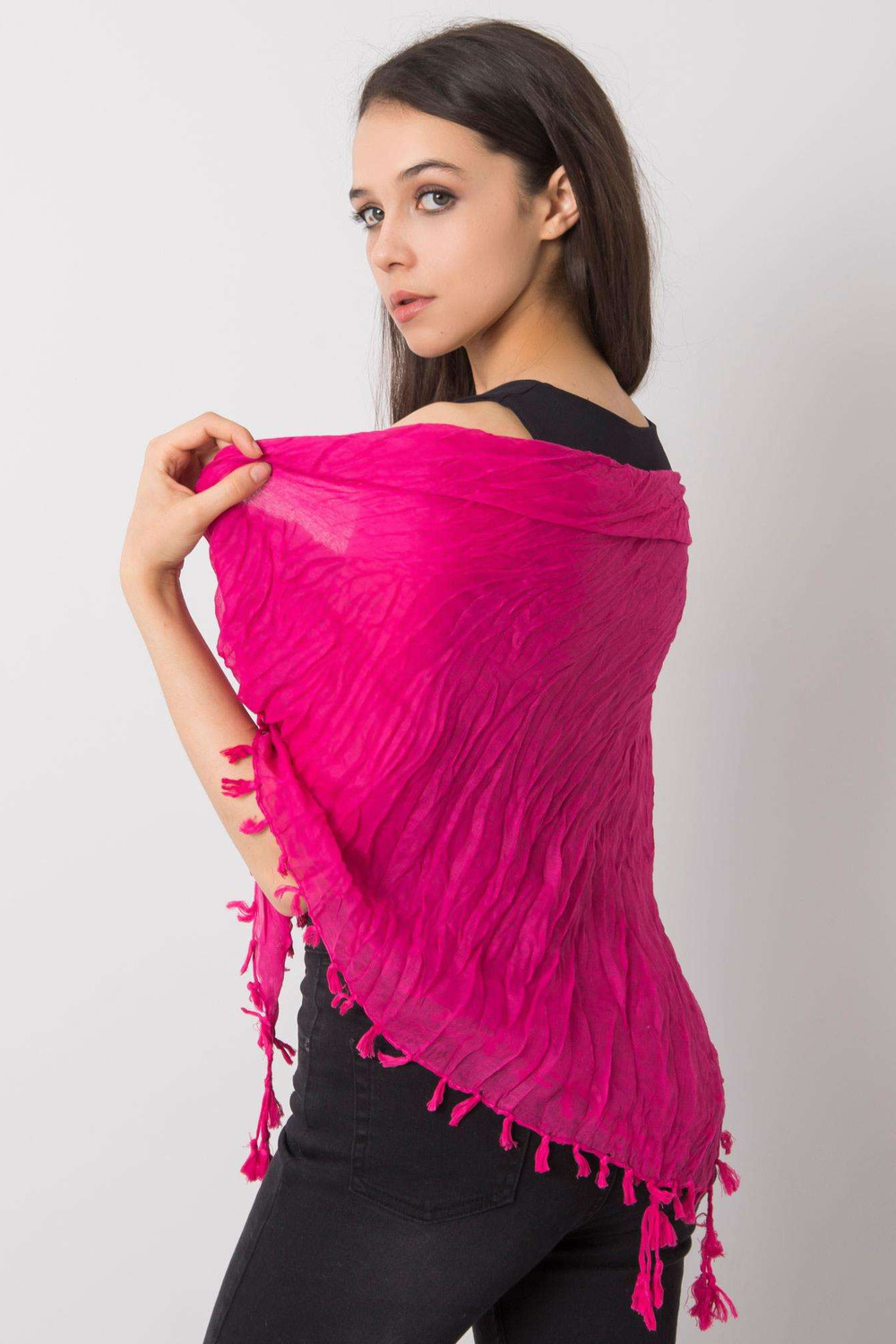 Fuksia värvi naiste sall franjadega.