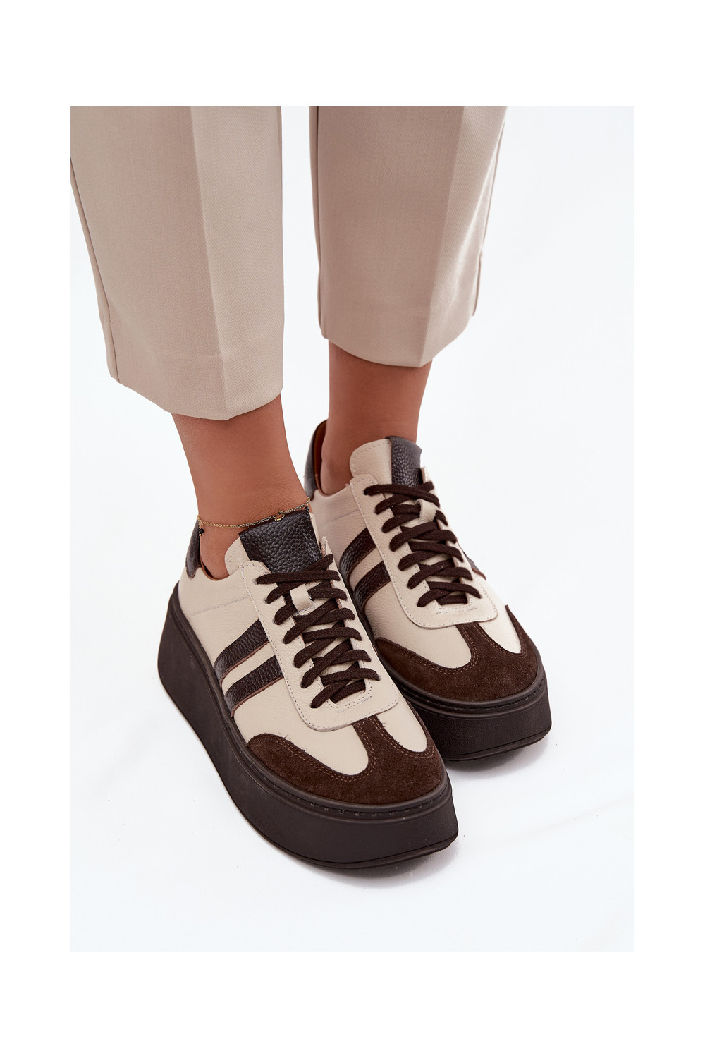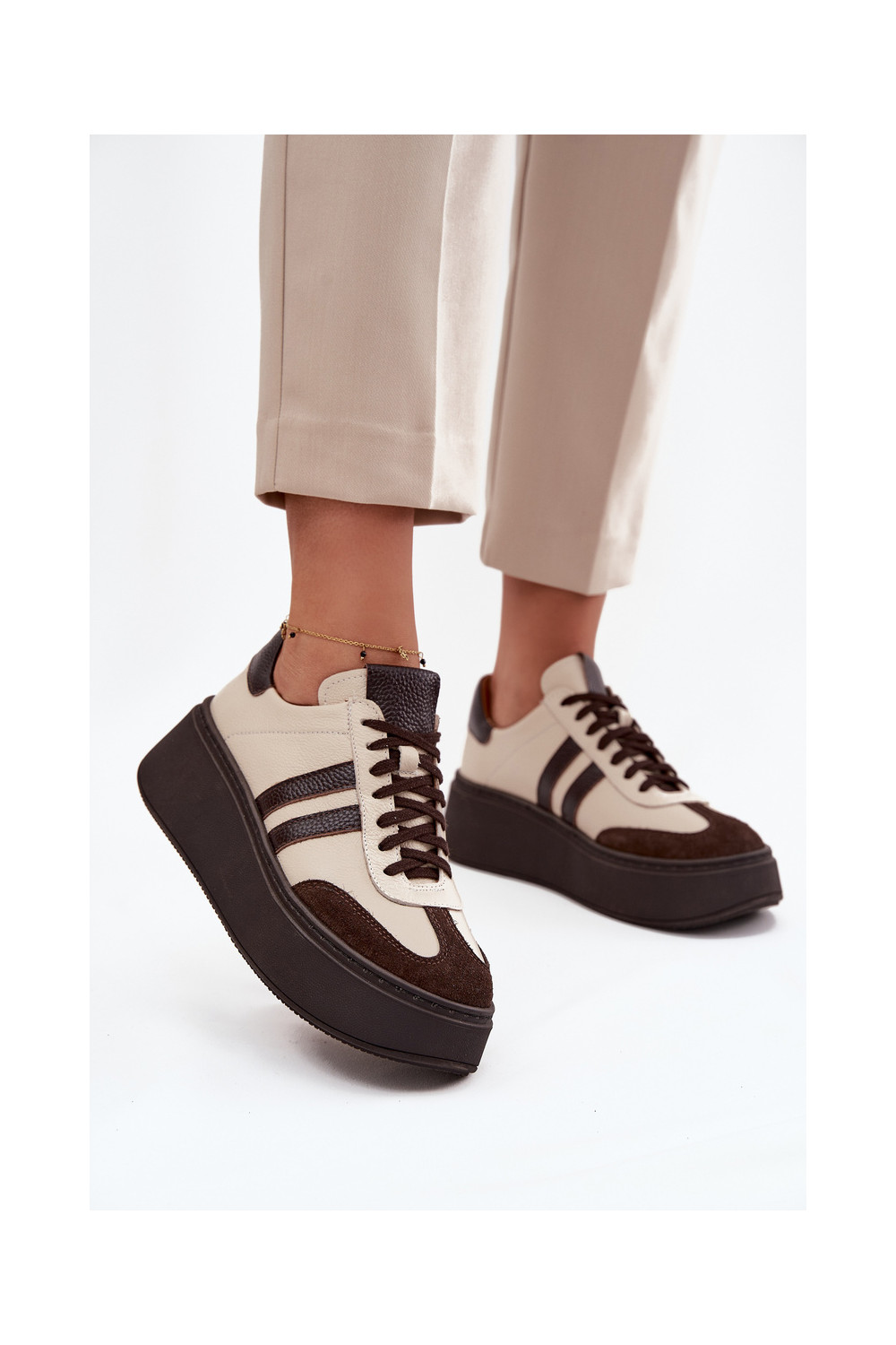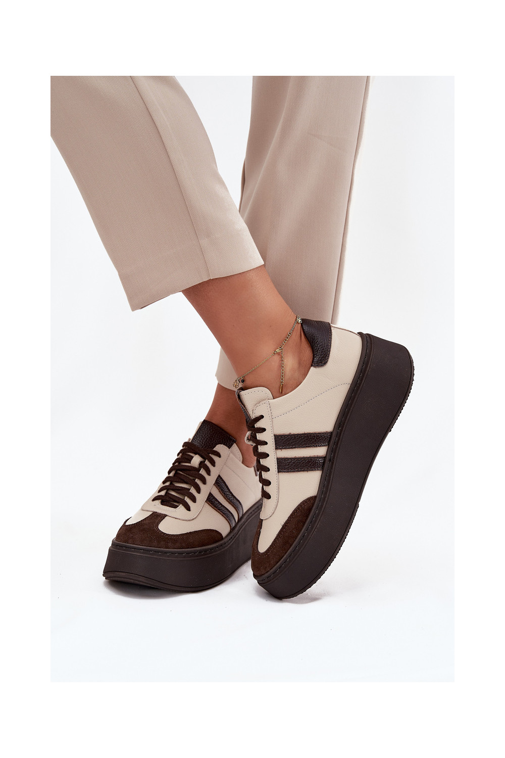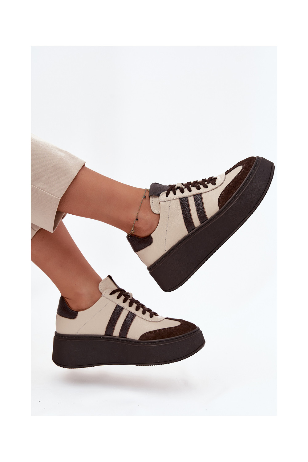 Nahast naiste sportlikud kingad platvormiga "Zazoo" 3775 liivakarva-šokolaadi värviga