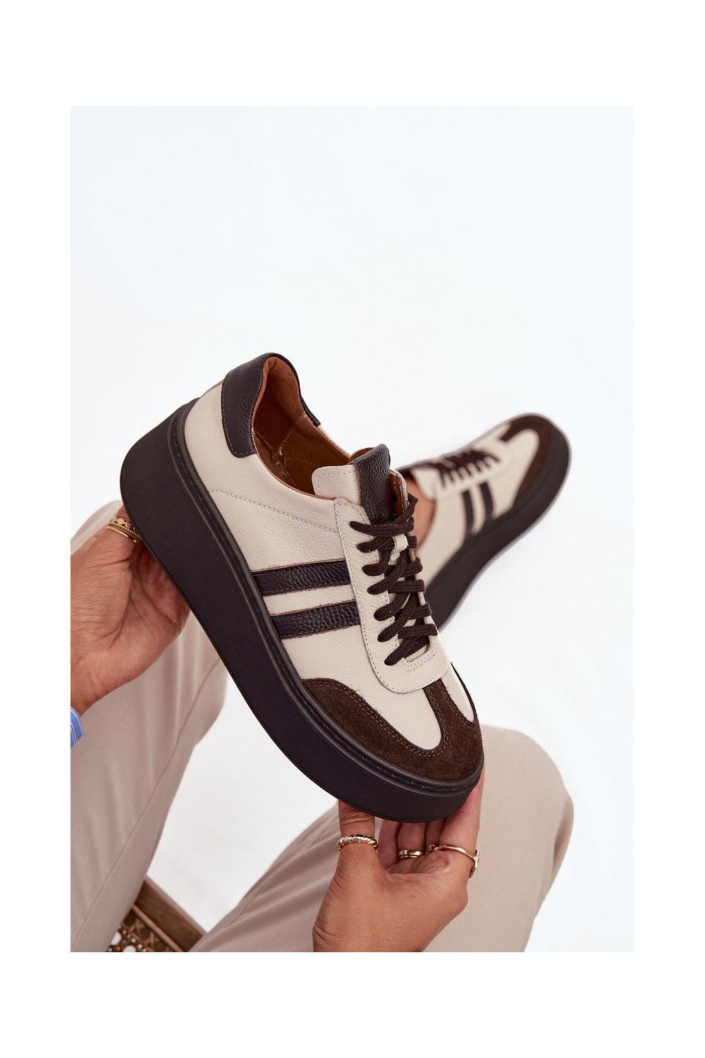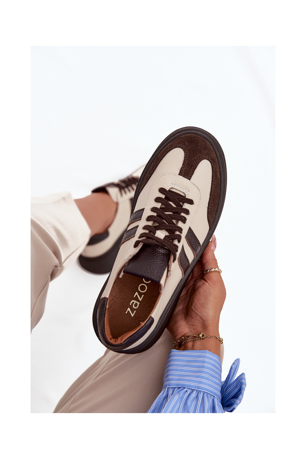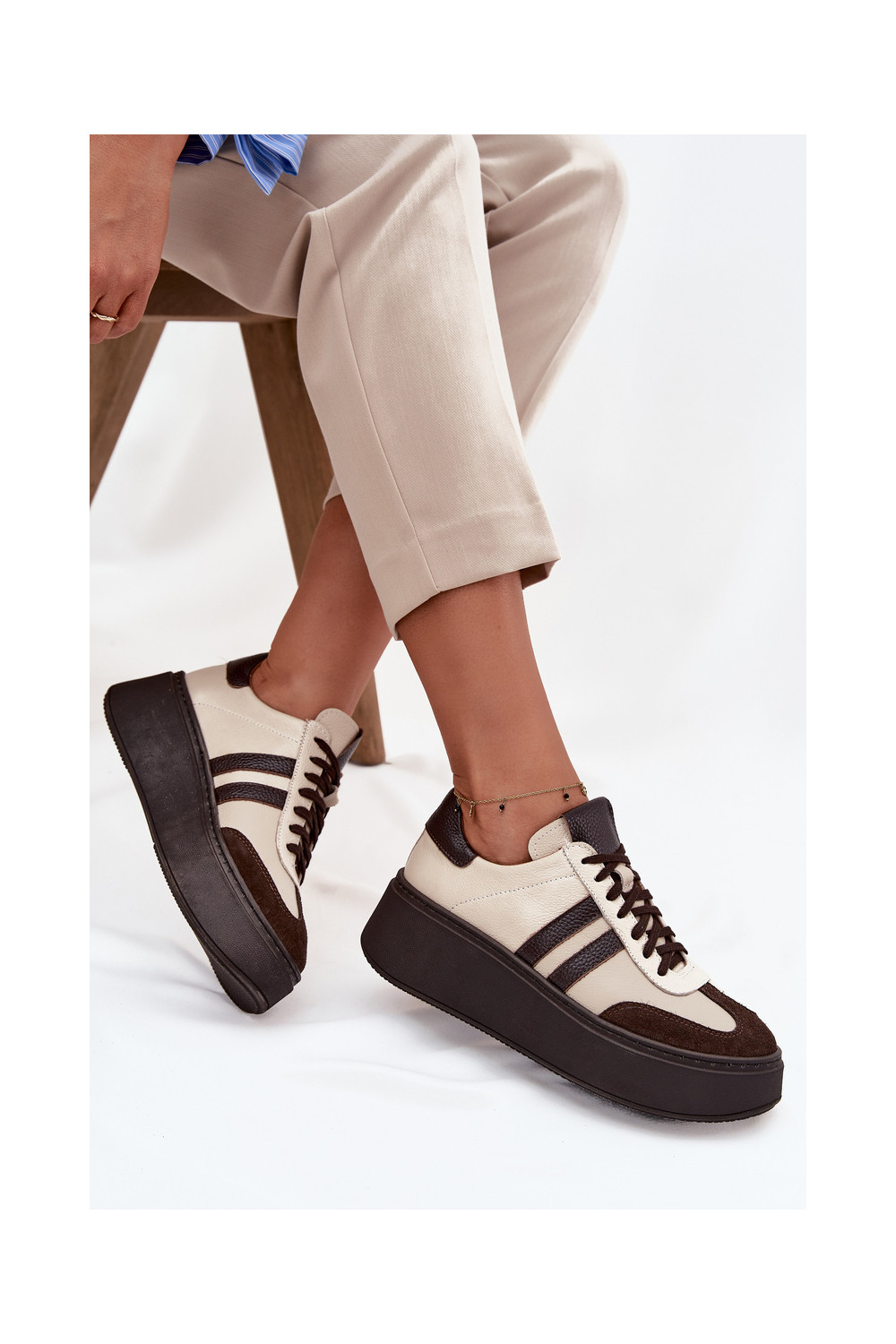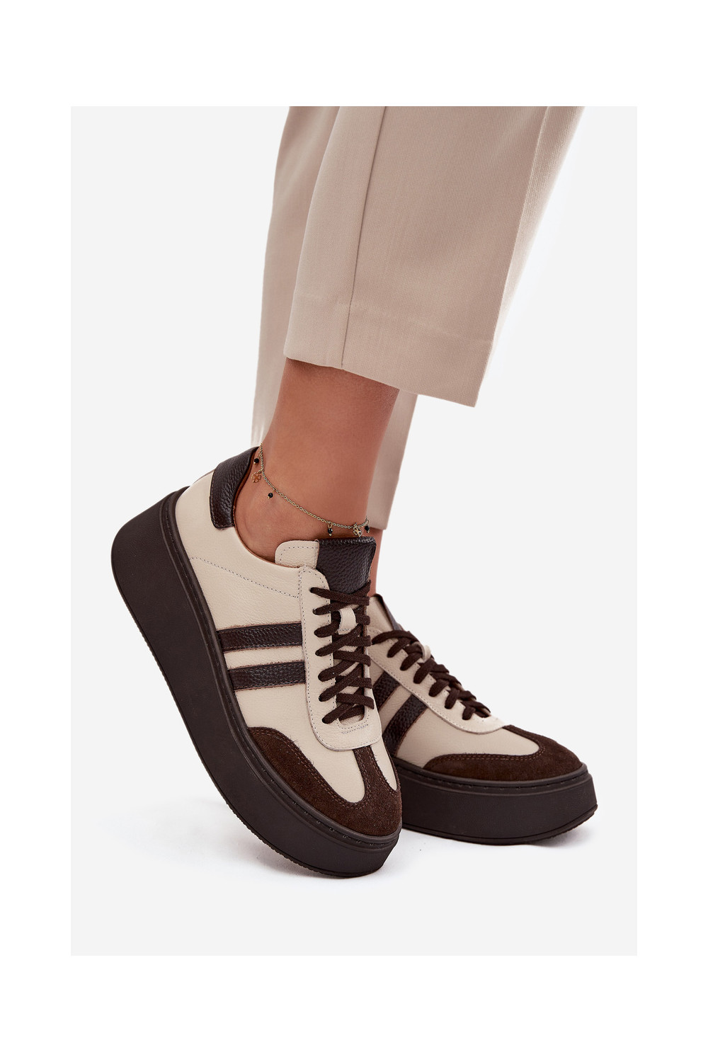 Nahast naiste sportlikud kingad platvormiga "Zazoo" 3775 liivakarva-šokolaadi värviga