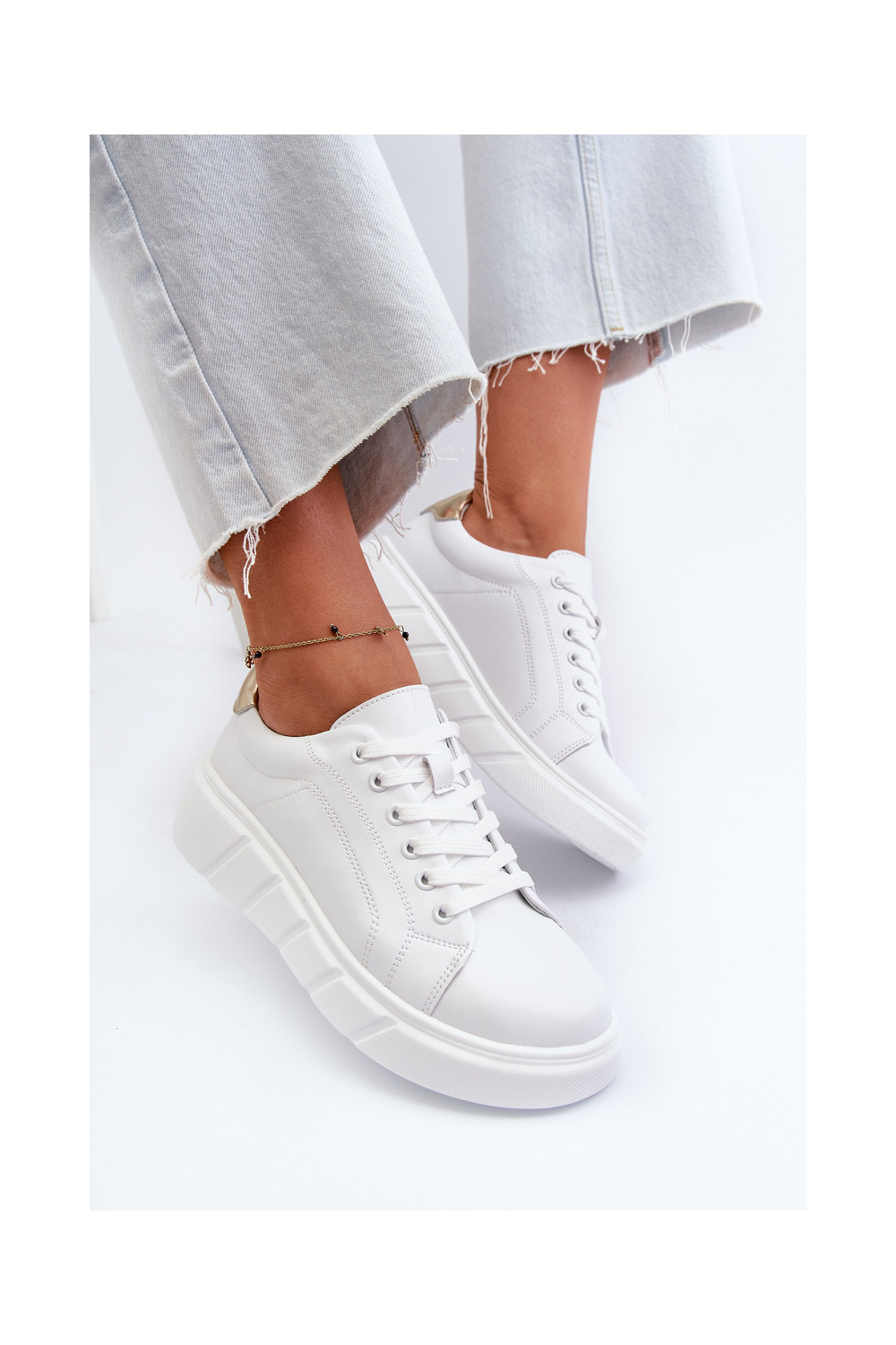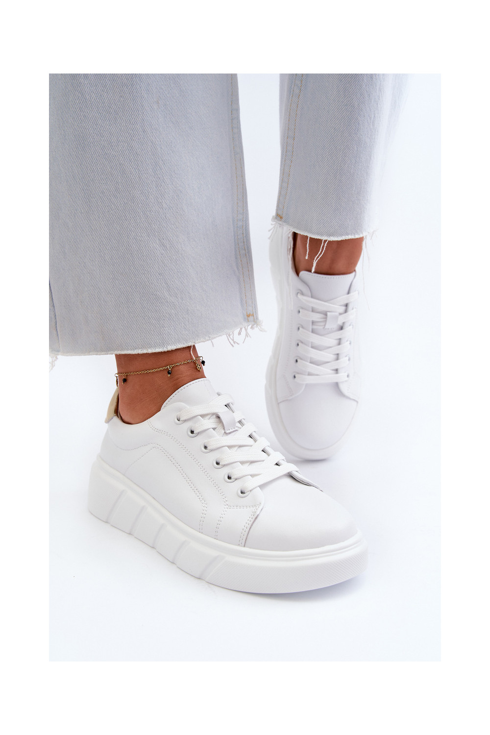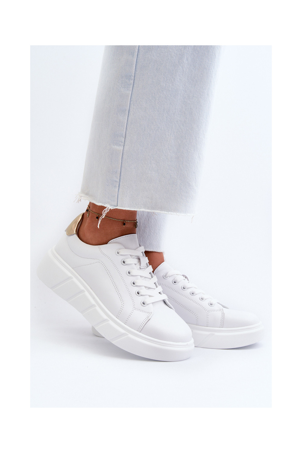 Nahast spordistiilis naistesaapad platvormiga valge