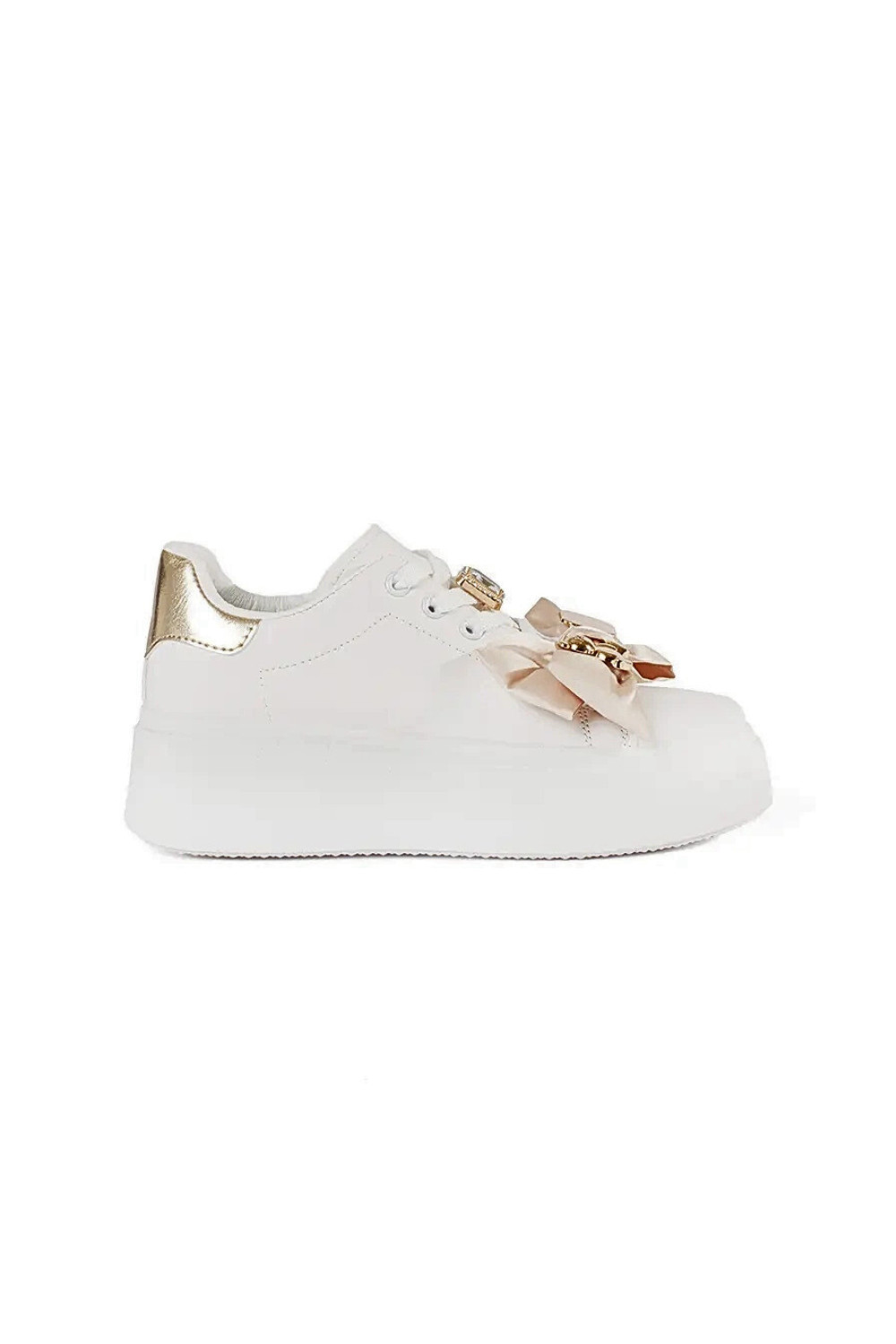 Valge-kuldne Sneakers mudel jalatsid kuldsete aksessuaaridega