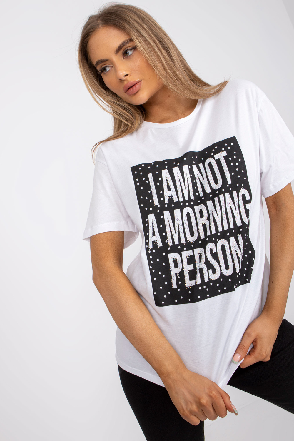 Valge aplikatsiooni ja lühikeste varrukatega T-särk .