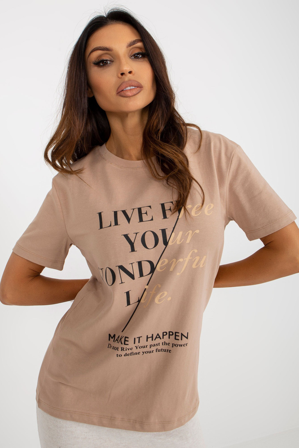Tumebeež puuvillase tekstiga naiste T-särk.