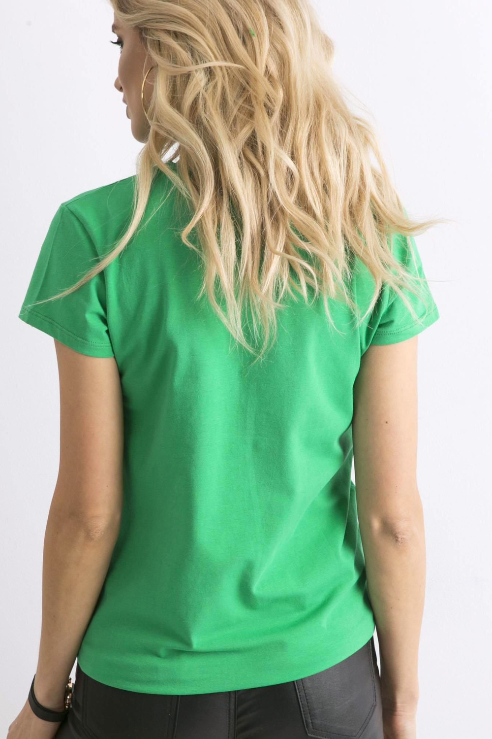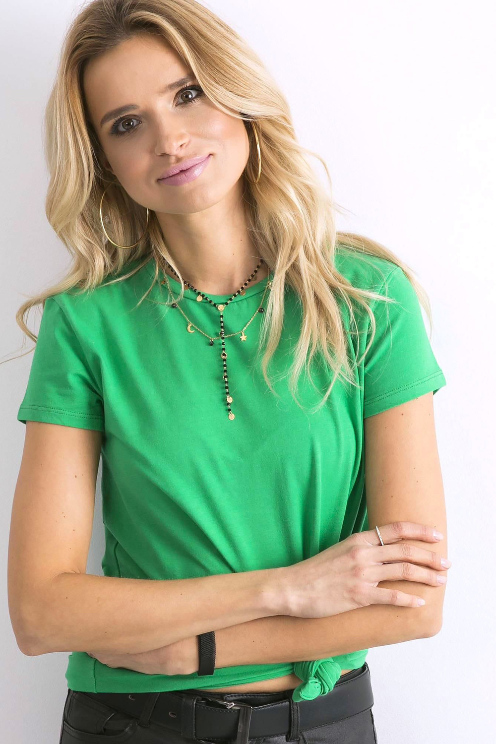 Virsikuvärvi roheline T-särk . Klassikaline puuvillane T-särk on tõeline aare iga naise kollektsioonis. Meil on tavaliselt sahtlis vähemalt paar sellist T-särki, mis võimaldavad kiiresti ja lihtsalt luua igapäevaseid stiile. Need on ülimalt universaalsed ja mugavad, mistõttu tasub oma garderoobi regulaarselt uute mudelitega värskendada. Sellel naiste T-särgil on traditsiooniline ümmargune kaelus ja lühikesed varrukad, seega on see väga mugav ega piira kandes liikumist. See on valmistatud kõrgeima kvaliteediga puuvillasest lõngast, millele on lisatud elastaani. Tänu sellele on T-särk ühtaegu õhuline ja katsudes pehme ning kehale meeldiv. Pealegi sobib see kenasti figuuriga ja sisaldab palju naiselikku võlu. Kandke seda teksade ja riidest pükstega, samuti lühikeste pükste ja seelikutega meie uusimast veebikollektsioonist.