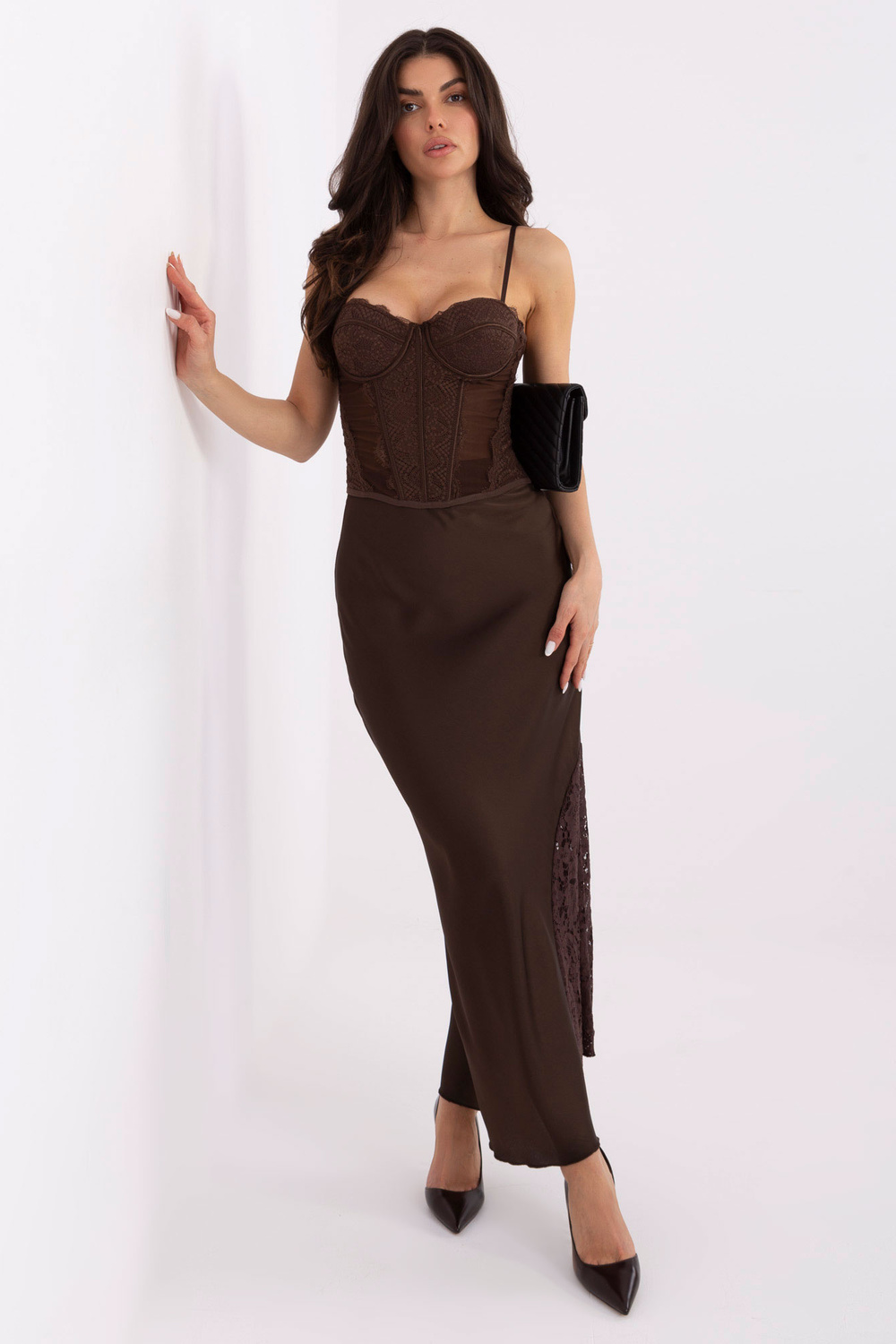 Model kannab S/M suurust. Modeli mõõtmed: pikkus 173 cm, rind 85 cm, vöö 62 cm, puusad 95 cm.