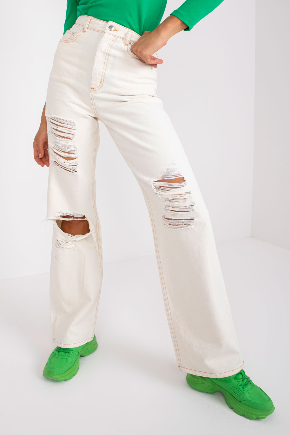 Aukudega kreemjas teksased Sylvie RUE PARIS . materjali koostis: 100% puuvill pesumeetod: masinpesu 30°C Tootekood: RO-SP-PNT-N08.75P domineeriv muster: ilma mustrita Stiil: vabaaja üritus: vabaaja, linna peal jalutama Mudel kannab suurust