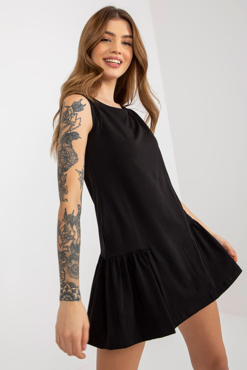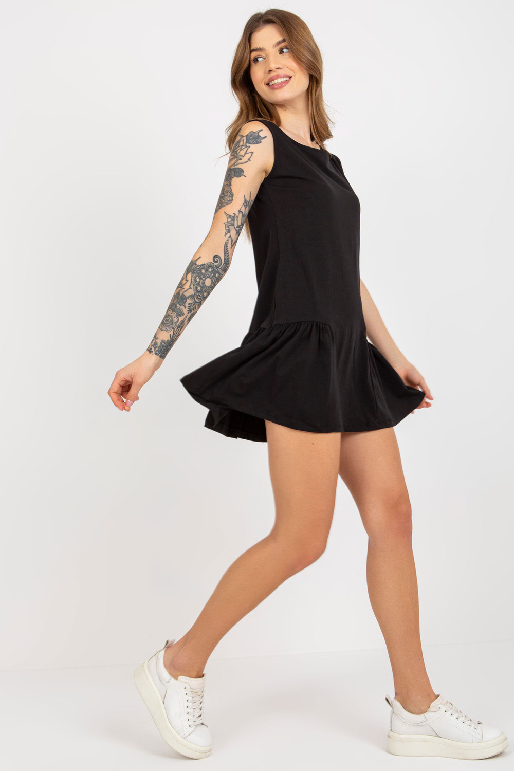 Must lihtne varrukateta minikleit flantsiga. tootekood: EM-TU-HS-20-282.38P domineeriv muster: sile Stiil: vabaaja üritus: vabaaja, jalutama, linna, suveks Modell kannab suurust S. Modelli mõõdud: kõrgus 173 cm , büst 7
